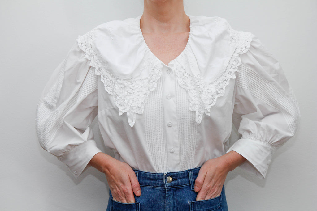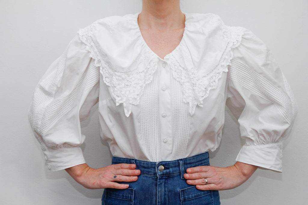 A unique vintage gem made from 100% cotton, featuring a stunning oversized collar with floral embroidery and lace trim that extends to the back. The voluminous puffy sleeves are embossed with subtle florals, adding dreamy texture and charm. A beautifully detailed piece that stands out effortlessly