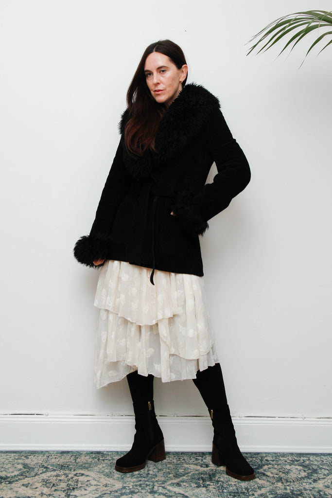 This incredible 1970s Penny Lane–style sheepskin coat is the ultimate winter statement piece. Crafted from luxurious black suede and lined with plush sheepskin, it’s as warm as it is stylish. The coat features dramatic sheepskin trims that frame the collar, cuffs, and hem, adding a touch of bohemian gothic glamour. The coat closes with a self fabric belt attached to the center of the coat. A timeless classic that embodies true 70s style and effortless cool.
