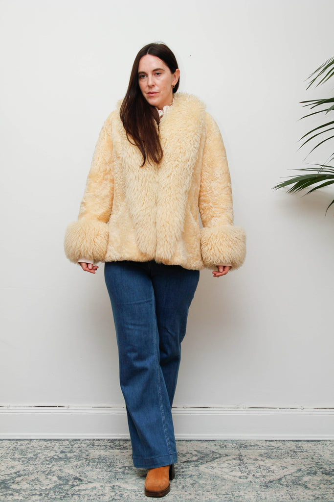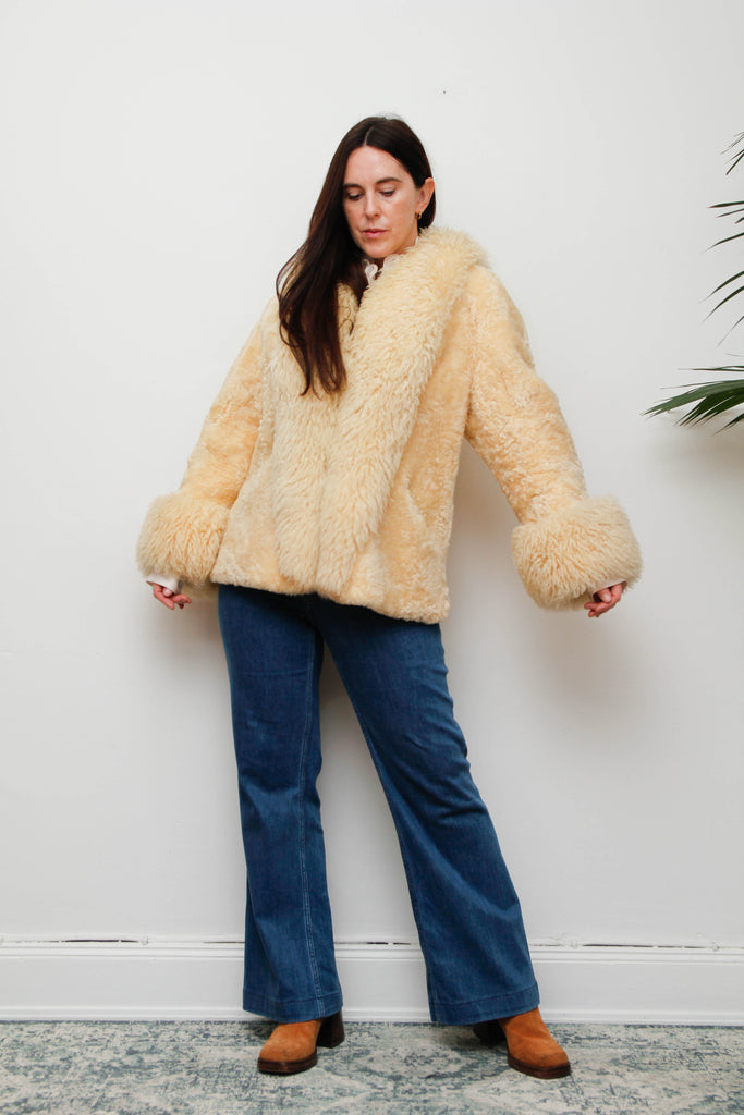 This epic vintage piece is crafted from natural cream shearling sheepskin, featuring an oversized collar that cascades all the way down the front and dramatic wide cuffs for true statement style. The boxy cut adds to its retro appeal, making it a magical vintage dream coat.