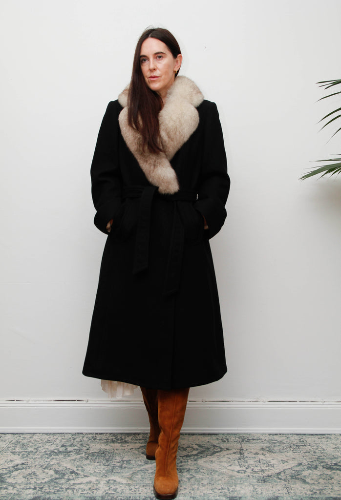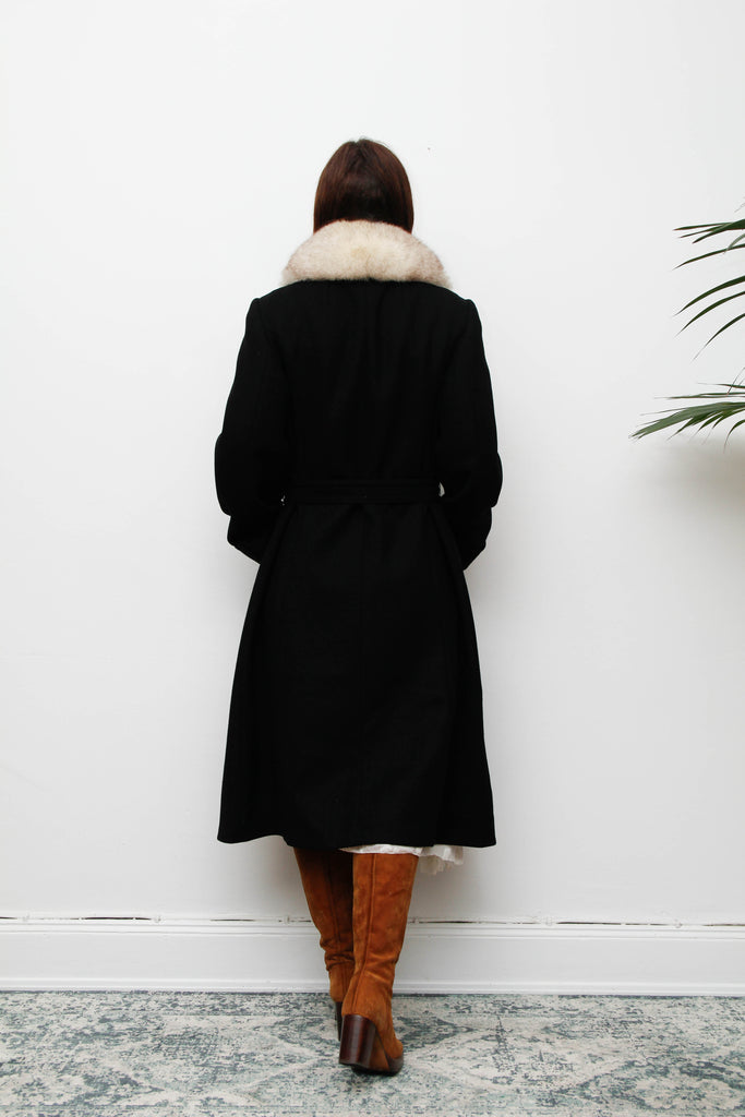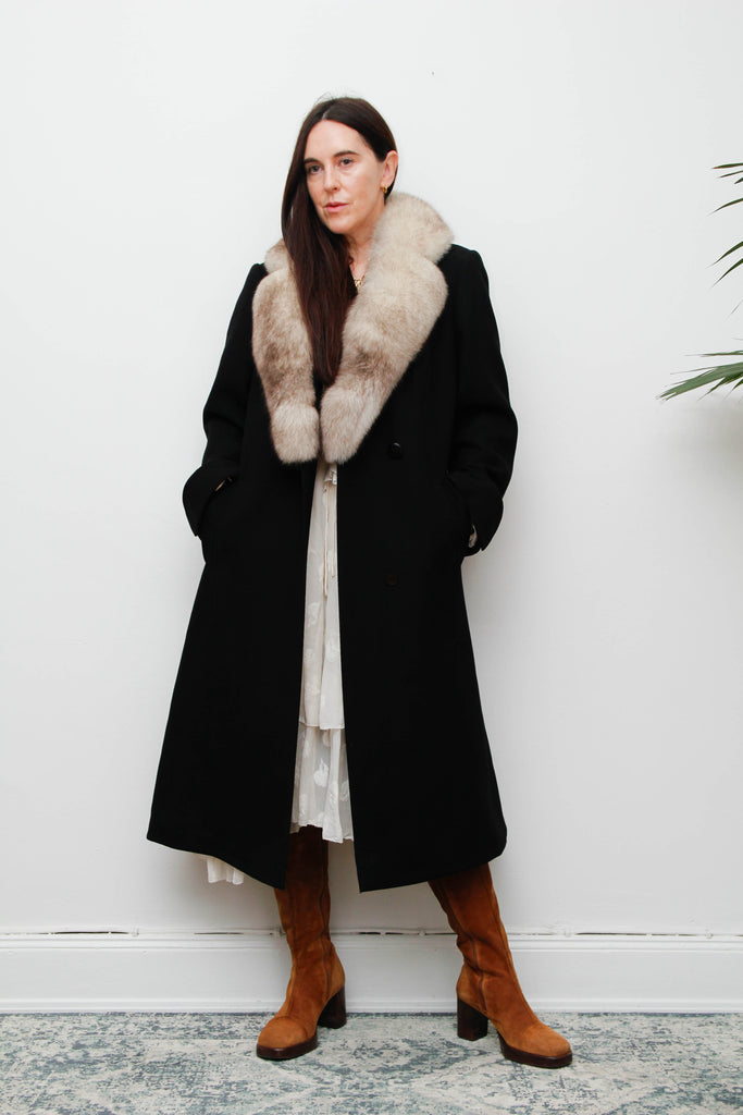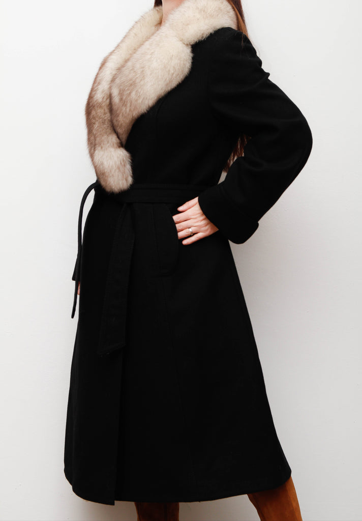 Vintage Black Wool Coat with Real Fox Fur – Luxurious Statement Piece