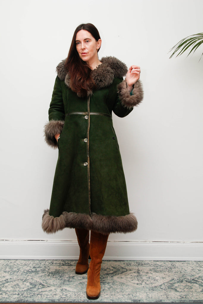 An exquisite and luxurious vintage sheepskin coat, crafted from the softest forest-green suede and trimmed with genuine grey-brown sheepskin fur cascading along the front, hem, and cuffs. The plush green sheepskin interior ensures exceptional warmth and comfort, while the fully lined construction reflects outstanding vintage craftsmanship. Made from 100% real suede and sheepskin, this rare statement coat blends timeless elegance with bohemian luxury — a true collector’s piece for lovers of distinctive vintage outerwear.