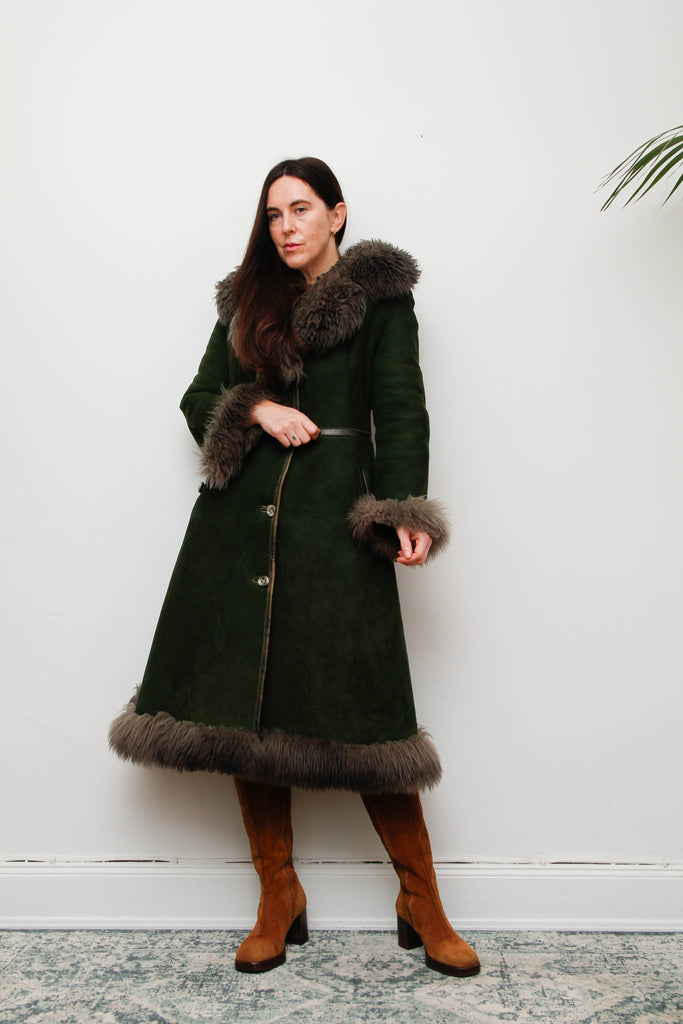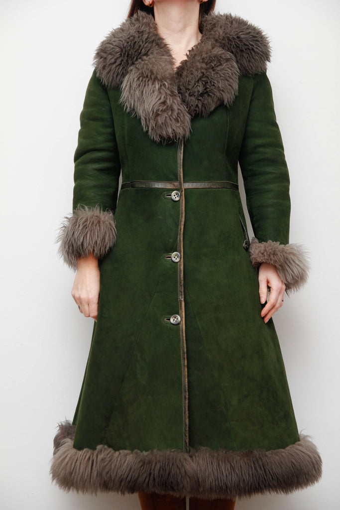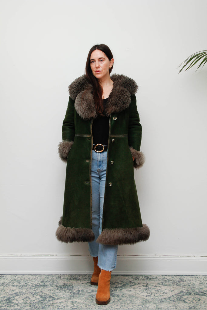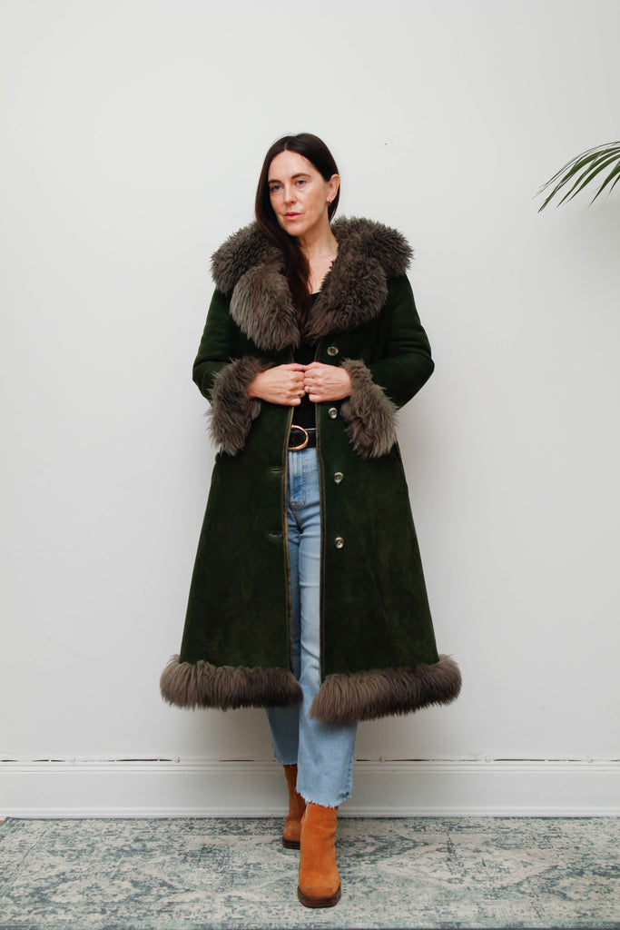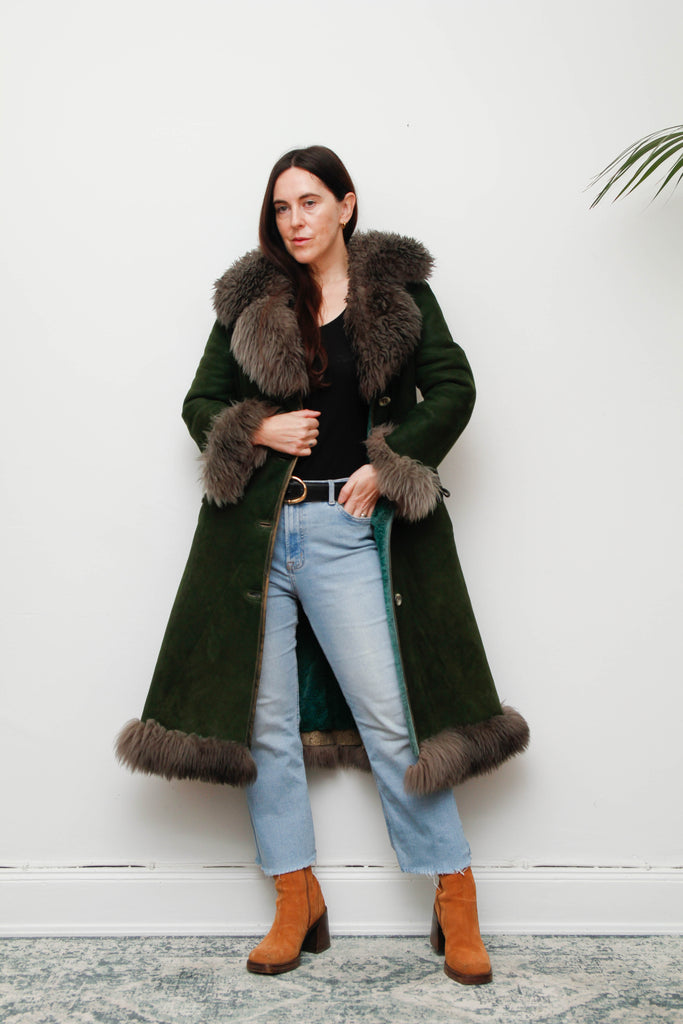 Vintage Forest Green Suede Sheepskin Coat with Grey-Brown Fur Trim