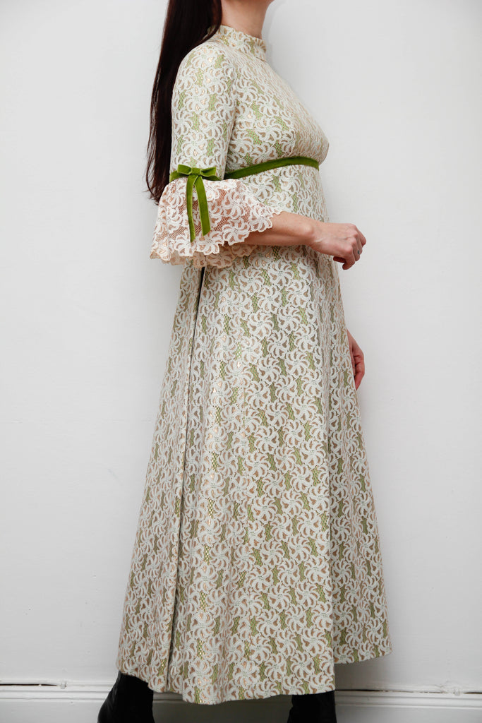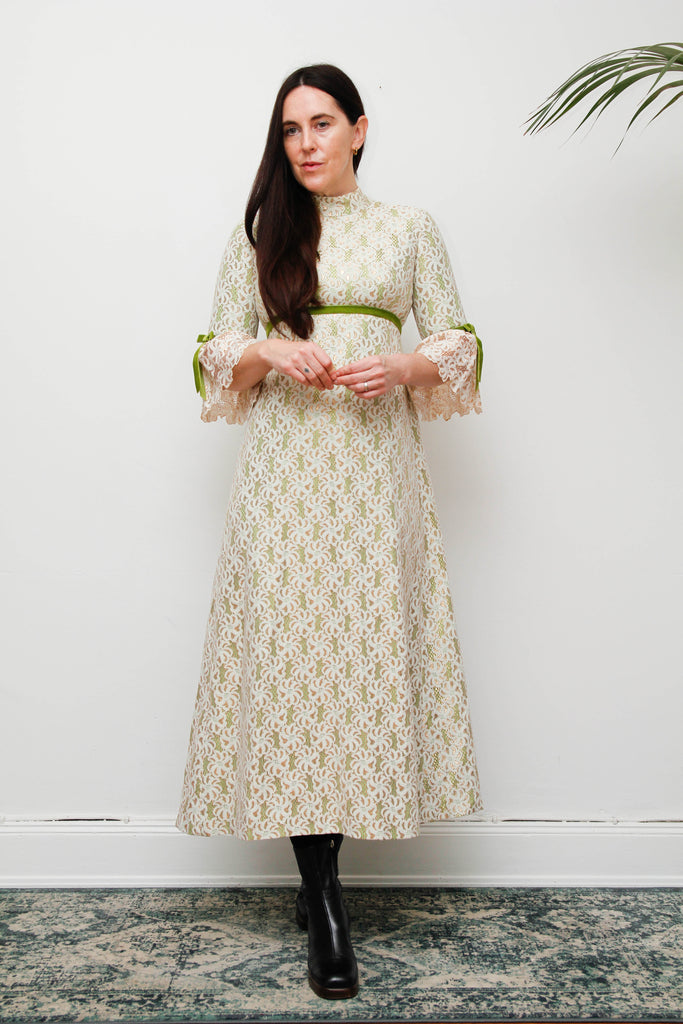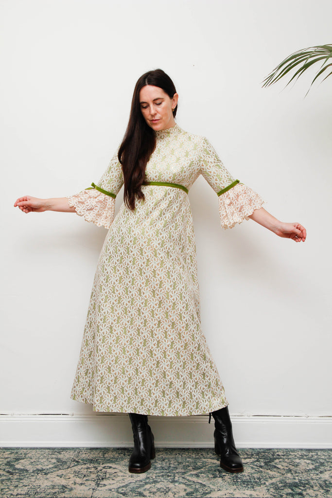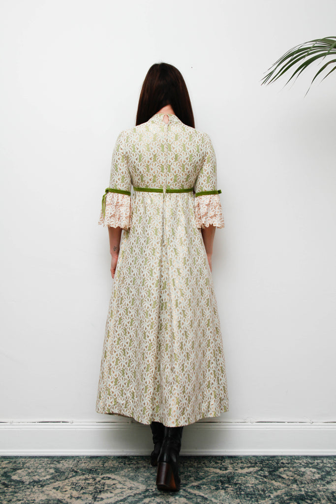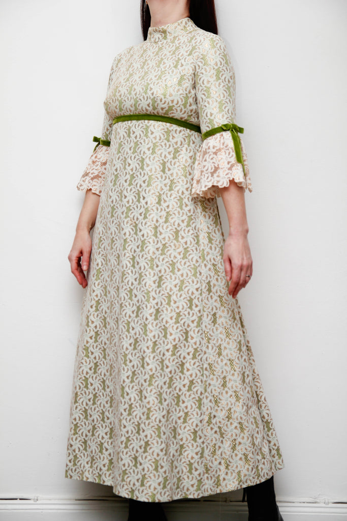 1960s Gold & Green Foil Lace Maxi Dress with Velvet Ribbon Trim