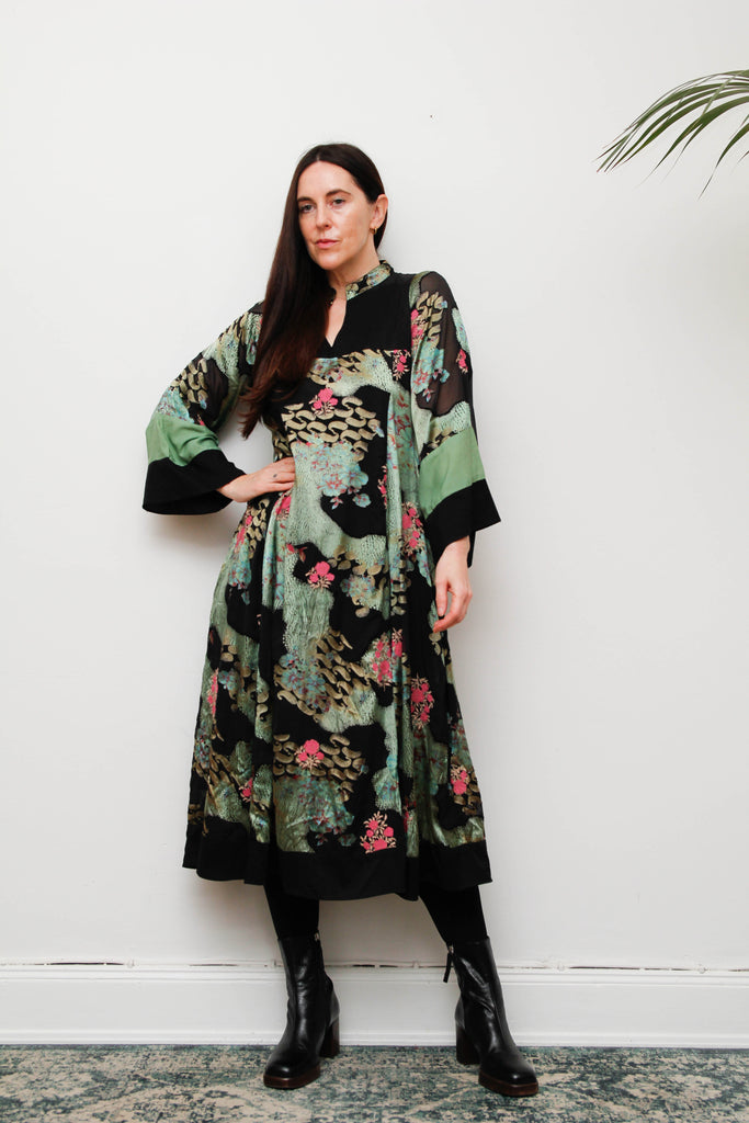 The most breathtaking oriental-inspired kaftan dress — a dreamy, ethereal vintage piece in shimmering black satin. The fabric is richly decorated with gold paisley feathers, swirling greens and pink florals, and delicate oriental motifs set against a striking black background, creating a captivating tapestry of colour and movement. The huge kimono-style kaftan sleeves drape beautifully, giving the dress a regal, flowing silhouette. Crafted from floral-embossed satin, it catches the light effortlessly, adding dimension and depth to every step. Maxi length and gloriously dramatic, this piece embodies gothic-bohemian elegance with a luxurious twist.