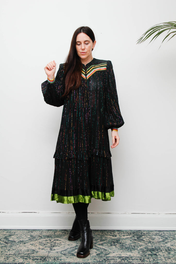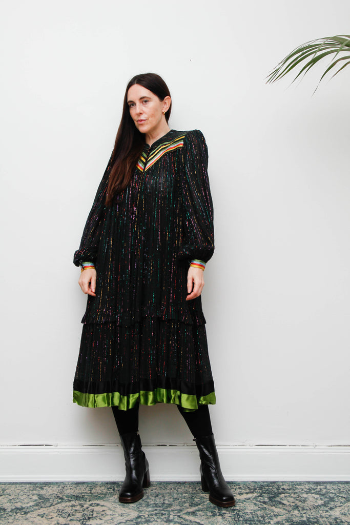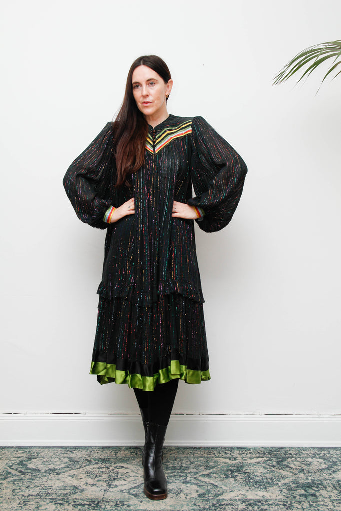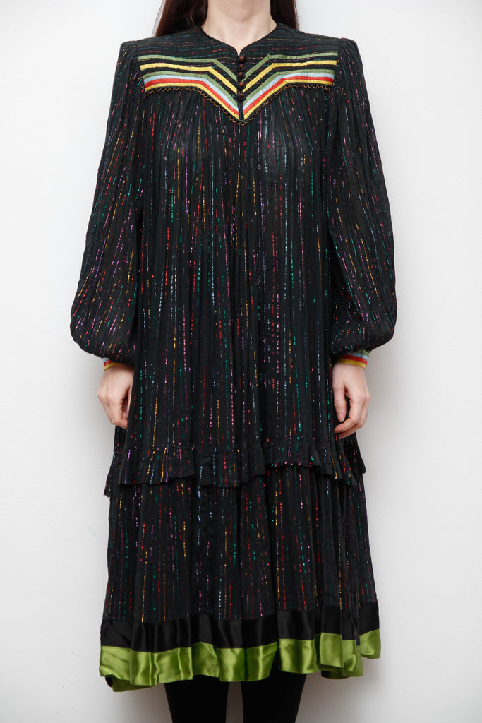 An incredibly rare vintage Indian cotton gauze dress by — a true treasure for collectors and lovers of bohemian fashion. Crafted from exquisite tissue-paper–light 100% Indian cotton gauze, it features vibrant colourful lurex threads woven throughout, giving it a magical shimmer in the light.