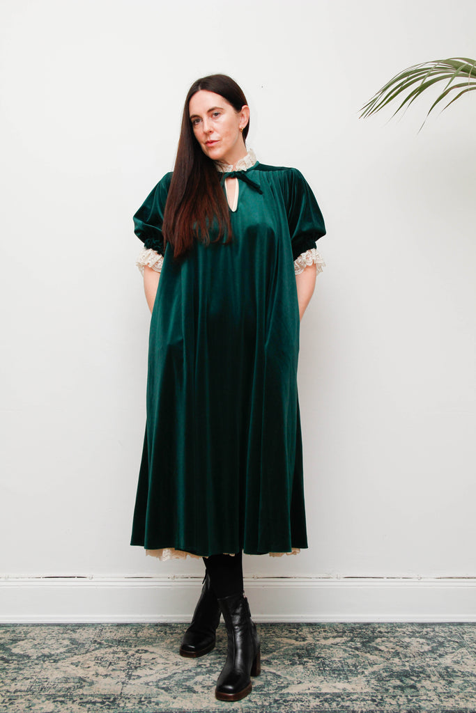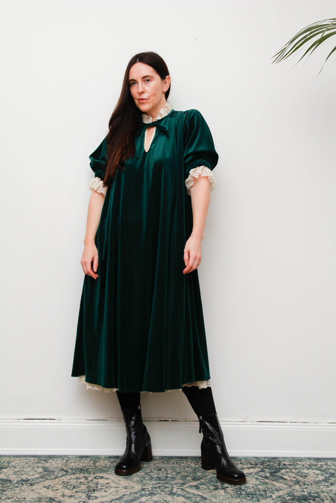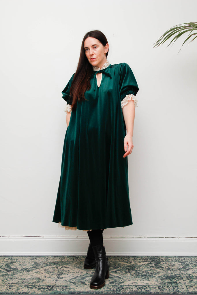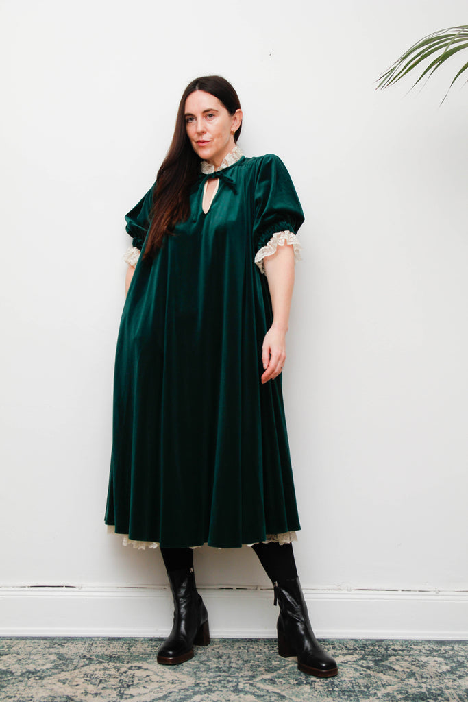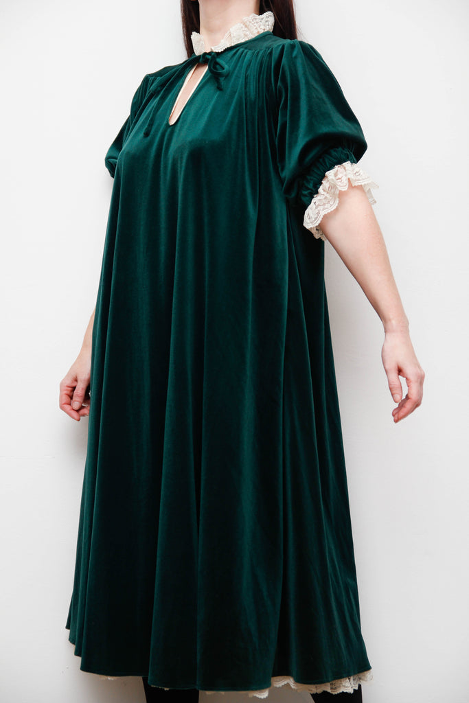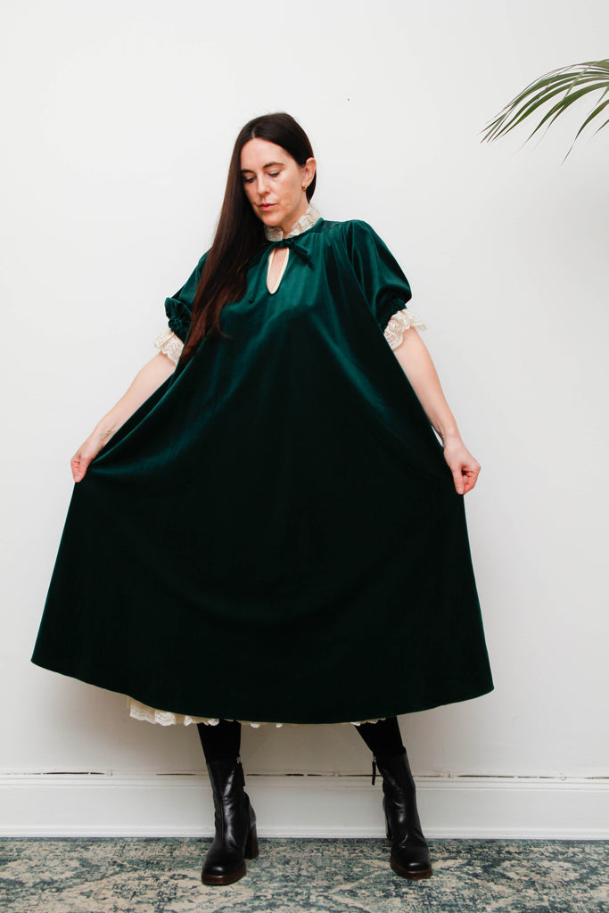 Rare Forest Green Velvet Quad Dress with Lace High Collar