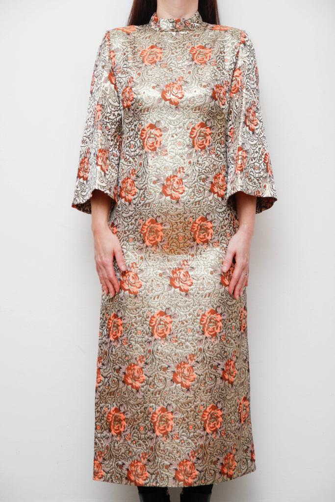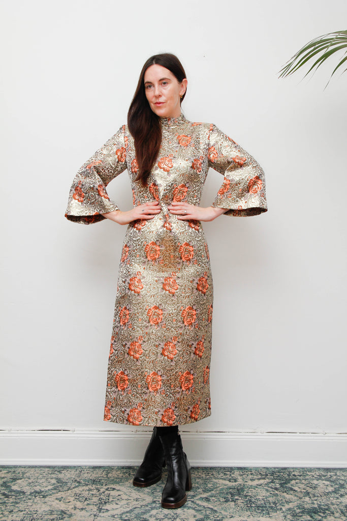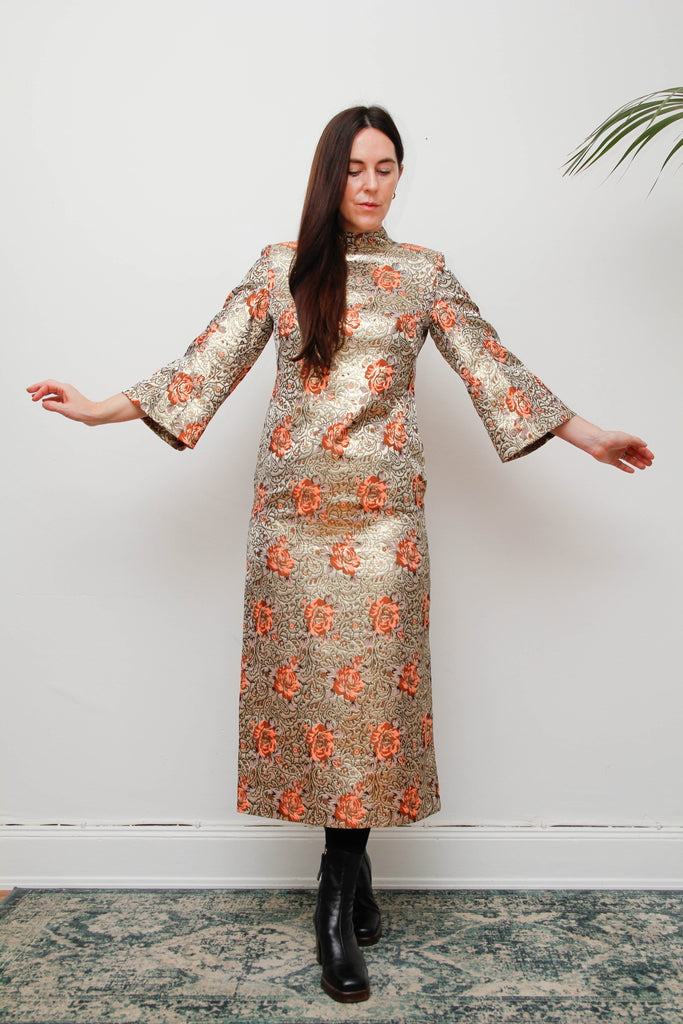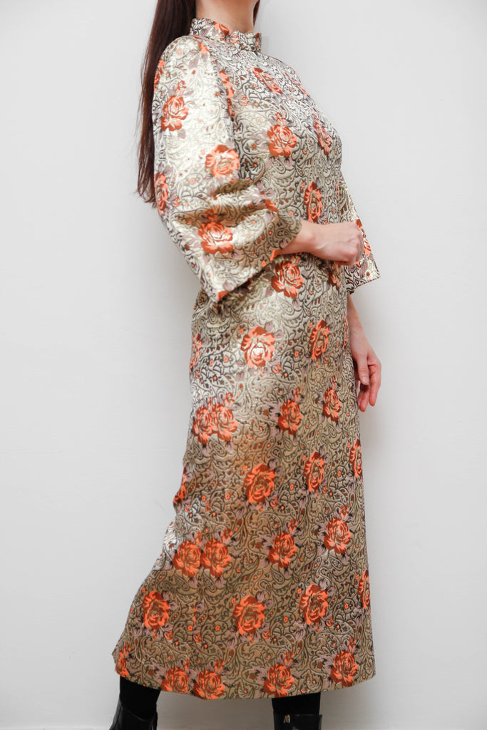 A breathtaking vintage treasure, this 1970s golden floral brocade kaftan dress radiates opulence and gothic elegance in the most classical way. The shimmering gold fabric is adorned with enchanting peach floral motifs, paisley details, and swirling vintage patterns that make this piece irresistibly captivating.