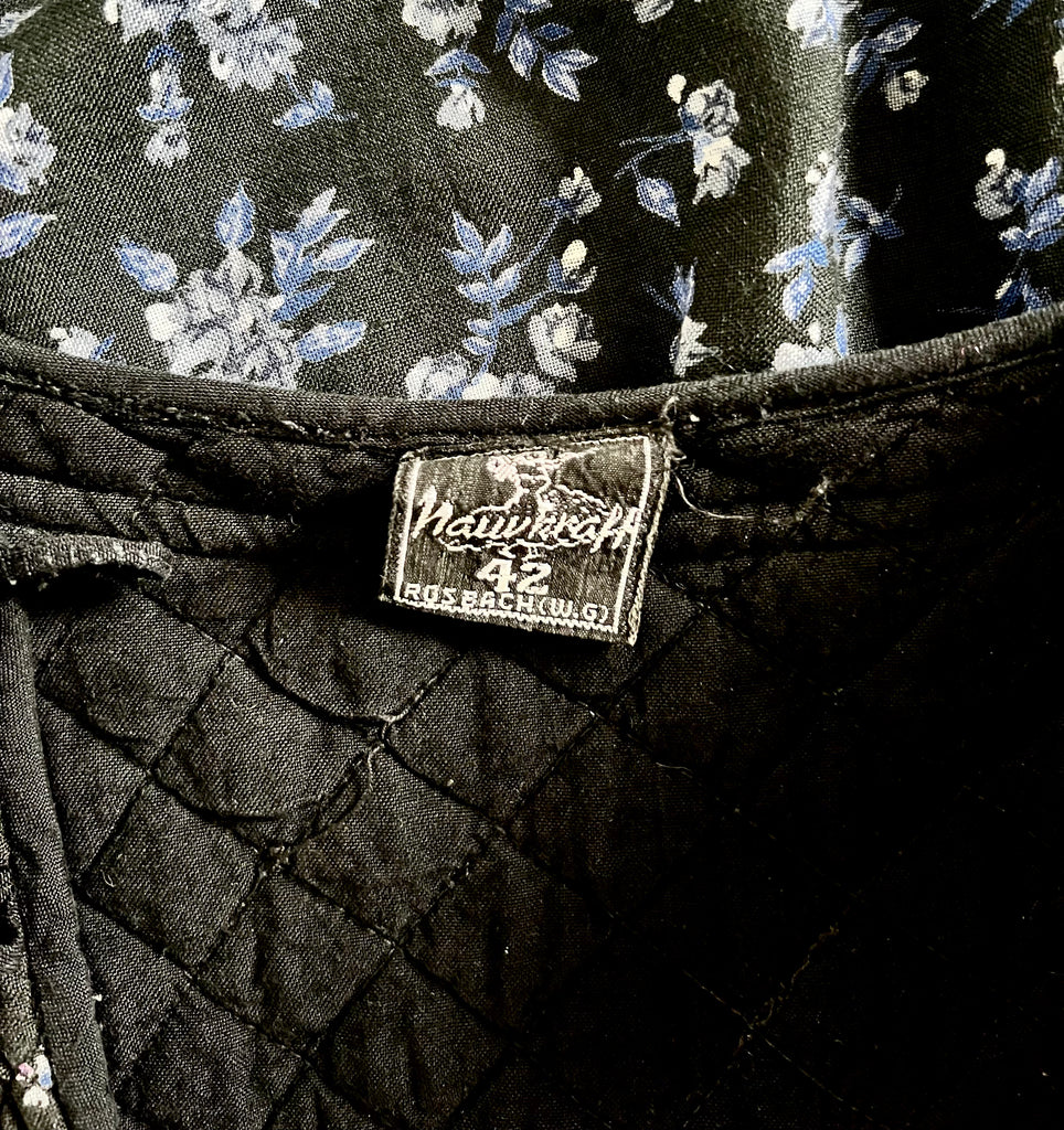 A beautifully rare 1970s cotton dress bursting with floral charm. Crafted from 100% cotton, it features a quilted bodice and a flowing skirt in inky navy adorned with delicate purple ditsy blooms. The fitted bodice contrasts with the skirt’s generous sweep, creating a free-spirited, bohemian silhouette. Complete with its original label intact, this timeless piece is a true vintage treasure.