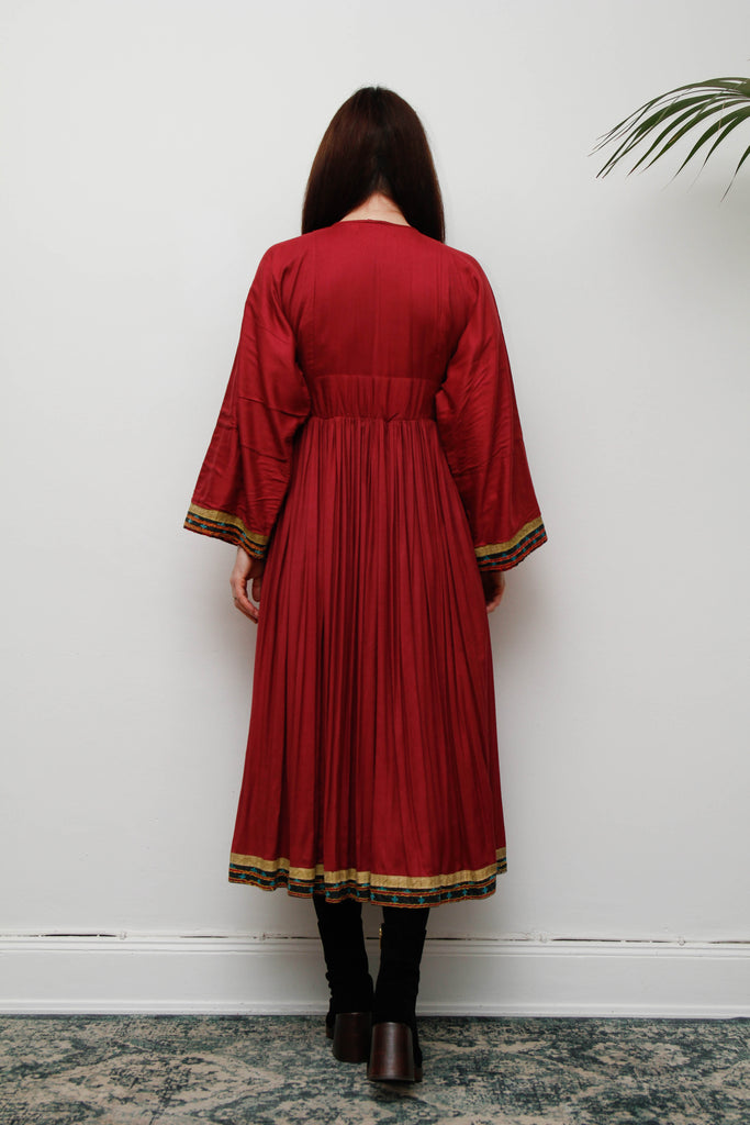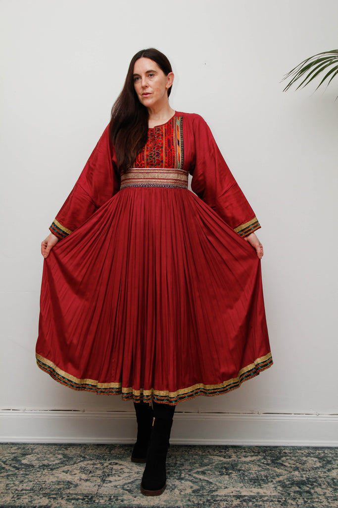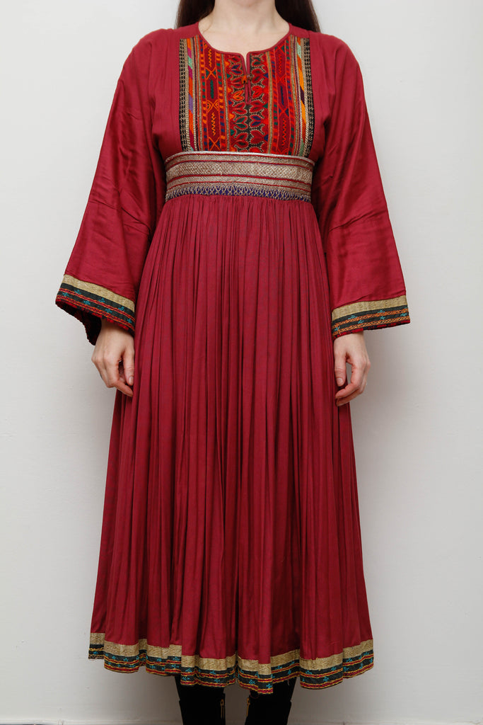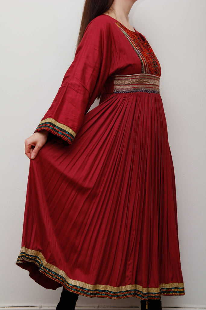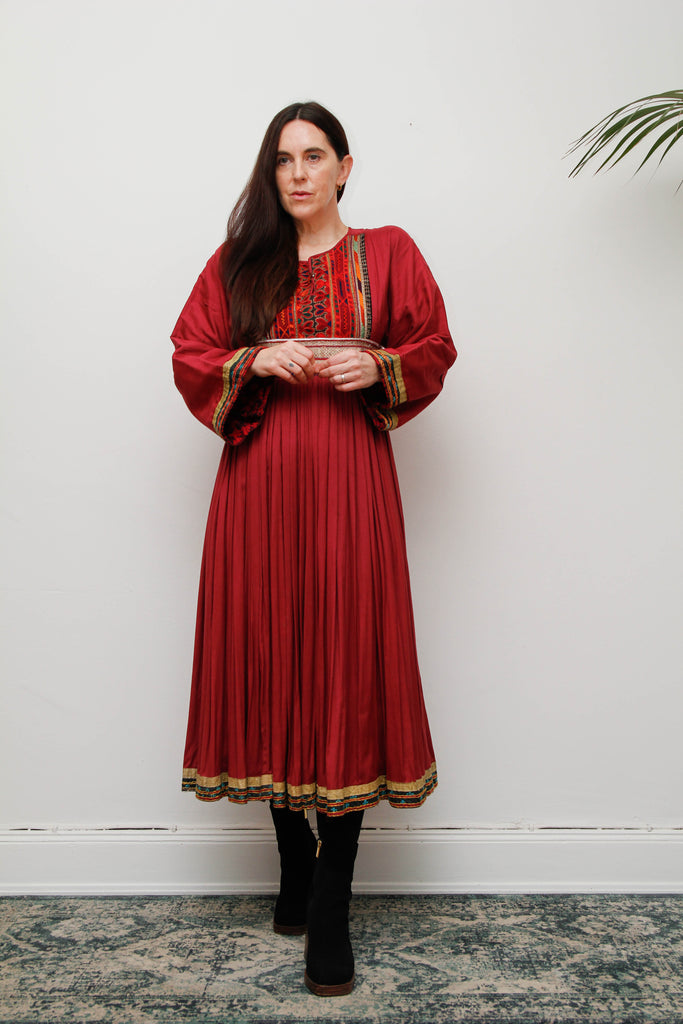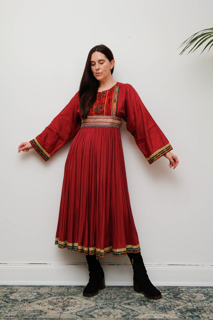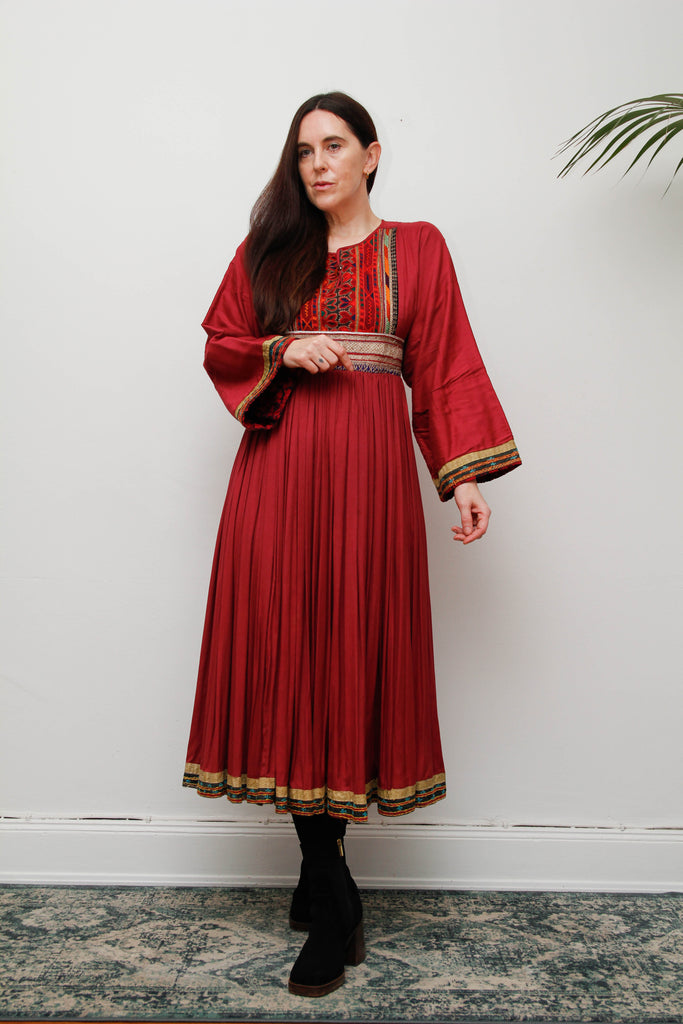 An enchanting vintage Afghan bohemian maxi dress crafted from rich, flowing rayon fabric. This ethereal piece features intricate hand-embroidered cotton folklore detailing across the bib, showcasing exquisite artisanal craftsmanship. A self-fabric tie cinches the waist, creating a flattering shape, while rare billowing sleeves add to the romantic silhouette.