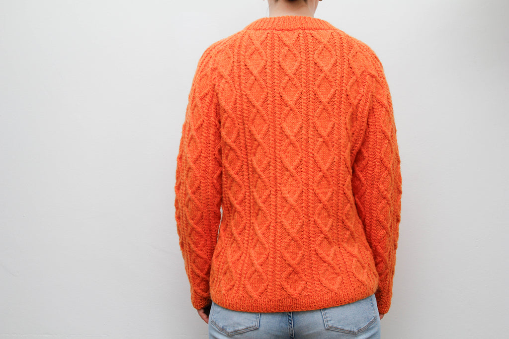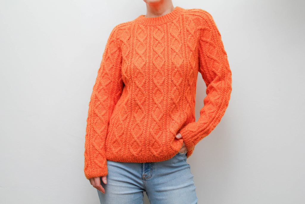 This classic, beautifully knitted cable jumper is a wardrobe essential. In a soft wool mix in an amazing pumpkin orange color, it features a lovely, intricate knitted pattern that adds texture. The jumper is fitted, offering a chic, geek-inspired style that's both flattering and timeless. Perfect for layering or wearing on its own, this piece combines comfort and sophistication effortlessly.