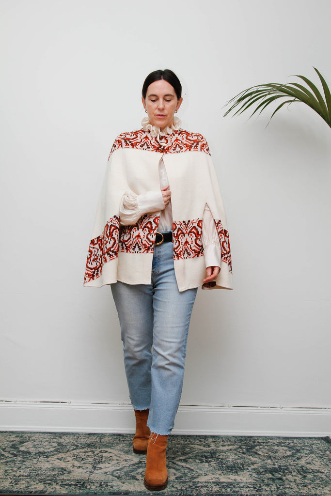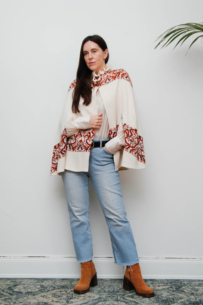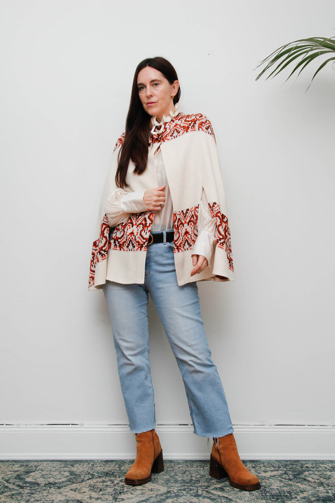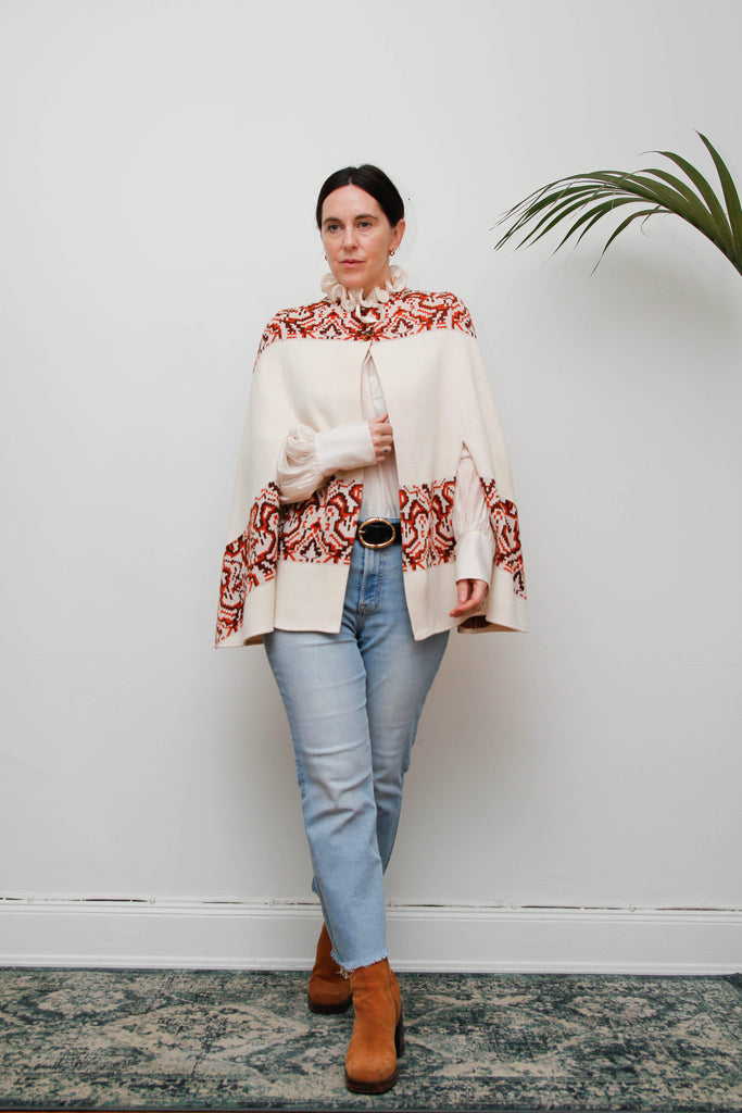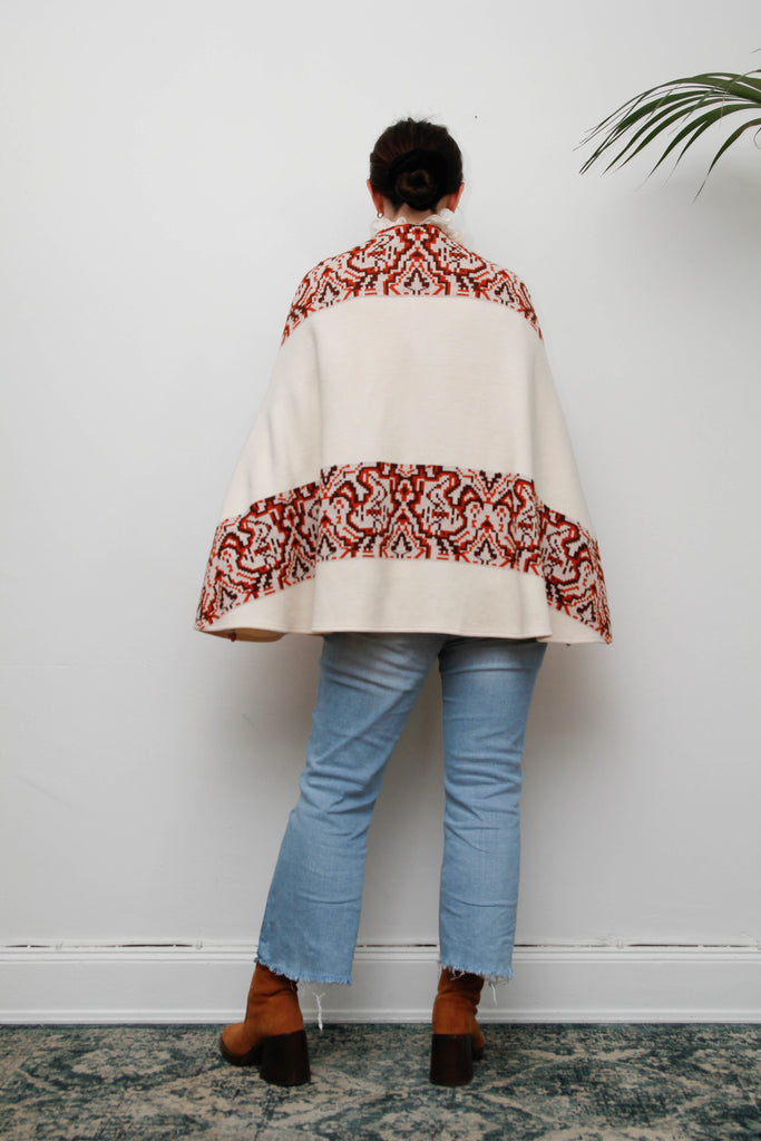 A beautiful original 1970s cream knitted cape, adorned with exquisite detailing and a charming rustic orange design woven into the knit. Featuring gorgeous chunky buttons around the collar, this piece perfectly captures bohemian vintage elegance. Ideal for day-to-evening wear, it’s a perfect transitional layer — cozy, timeless, and effortlessly stylish.