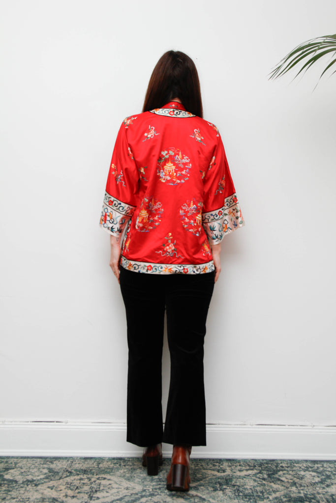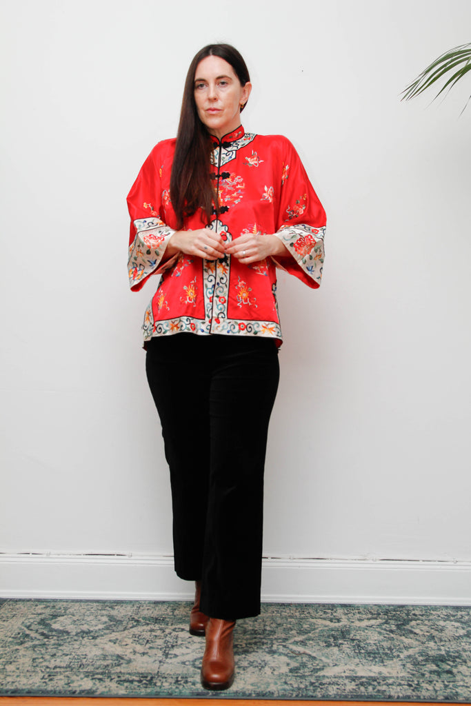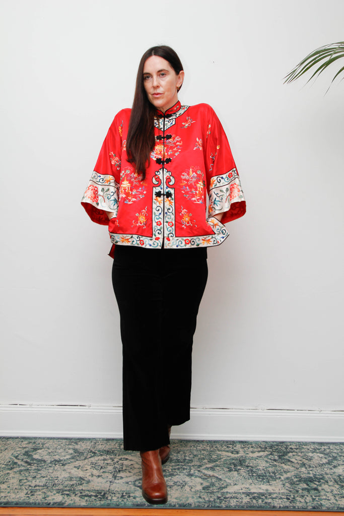 Antique Red Oriental Silk Robe Jacket with Hand Embroidery