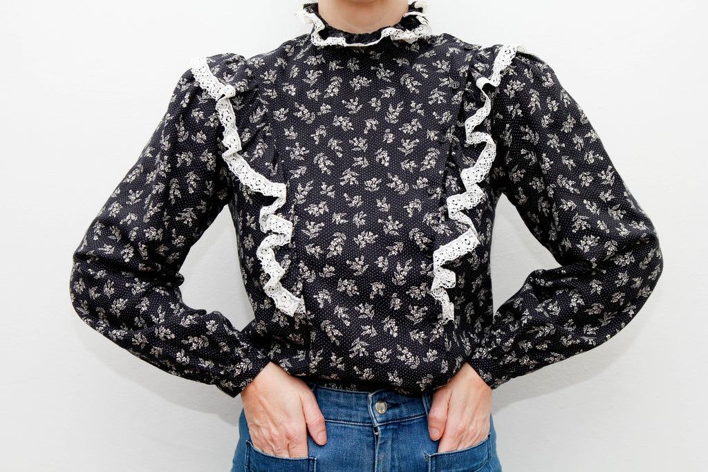 Vintage 1970s Prairie Blouse – Navy Ditsy Floral with Frills
