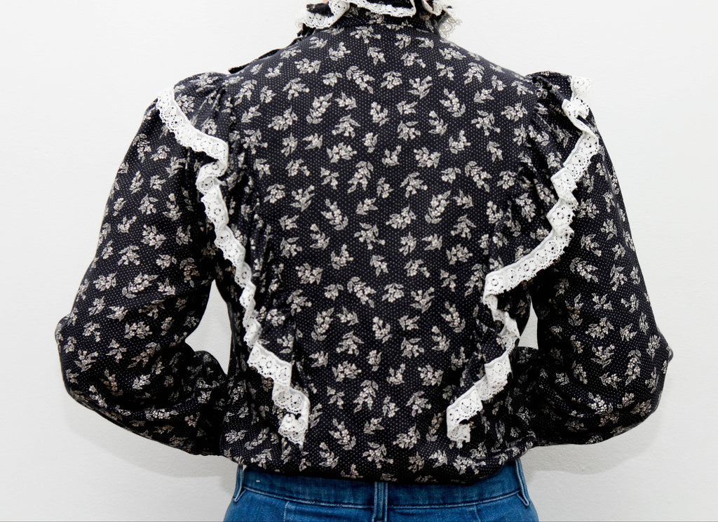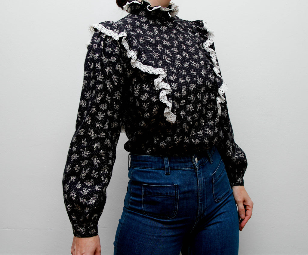 A true must-have for any vintage lover, this blouse features dramatic balloon sleeves and a high Victorian-inspired collar adorned with layered frills for a touch of romantic charm. Lace-trimmed cuffs add delicate femininity, while the soft fabric showcases a sweet floral sprig pattern. Perfect styled with jeans for an effortlessly chic yet timeless vintage look.