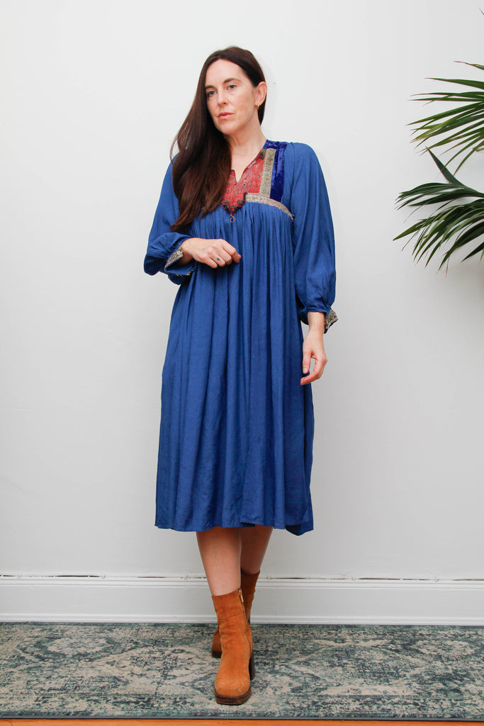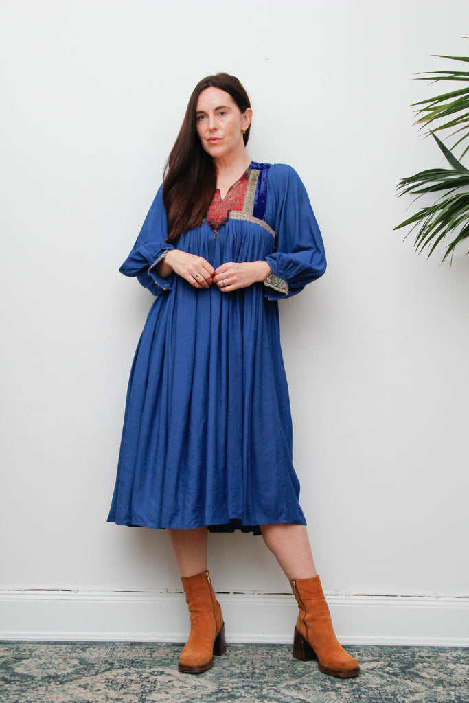 This striking bohemian piece features a rich velvet bib and sleeves in regal royal tones, contrasted with airy cotton for balance. The silhouette is truly dramatic — with voluminous balloon sleeves and a sweeping circle skirt that moves with effortless grace. Hand embroidery enhances its artisanal beauty, making it a rare and authentic vintage treasure.