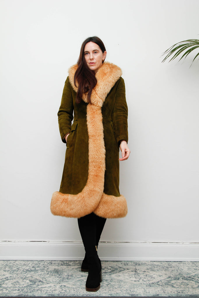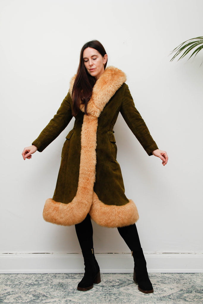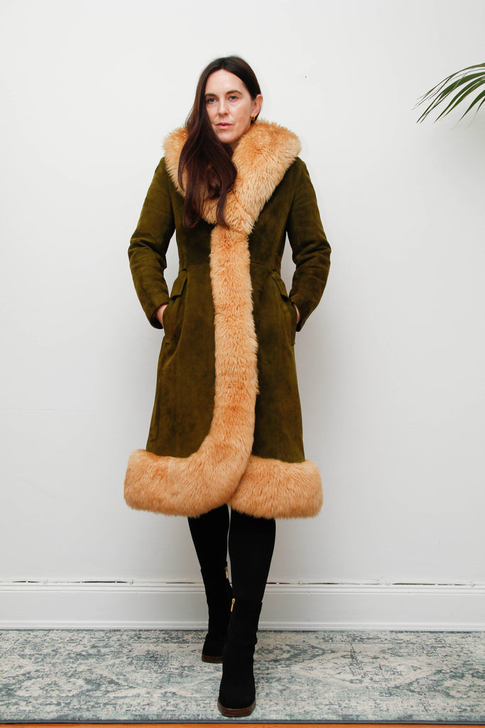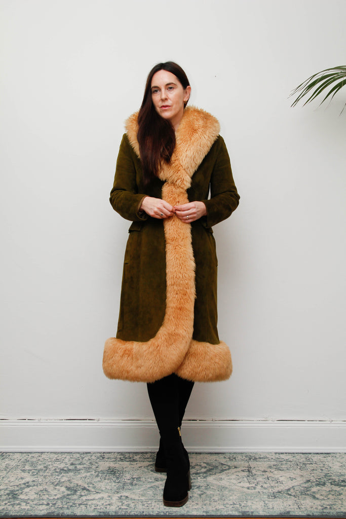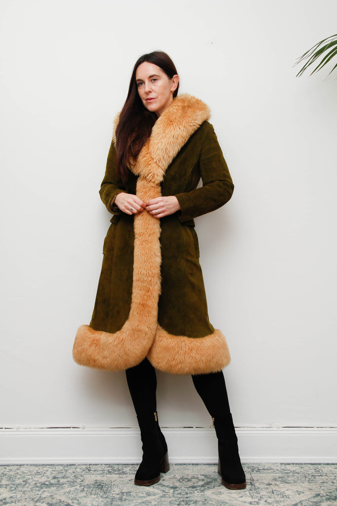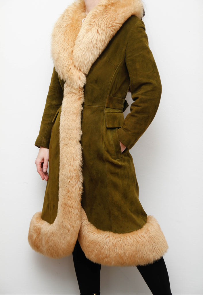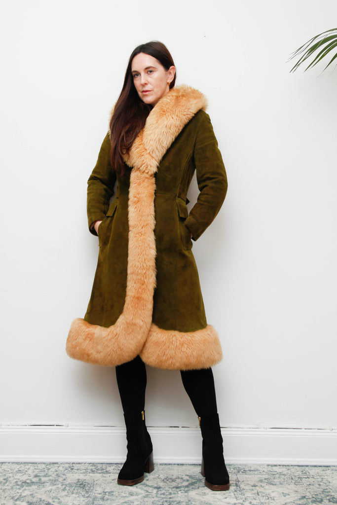 An exquisite and luxurious rare vintage coat, crafted from buttery-soft olive suede and trimmed with real cream sheepskin fur that cascades beautifully down the front and around the sweeping hem. The high-quality acetate lining ensures warmth, comfort, and elegant structure, making it as practical as it is breathtaking.