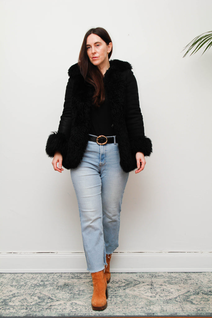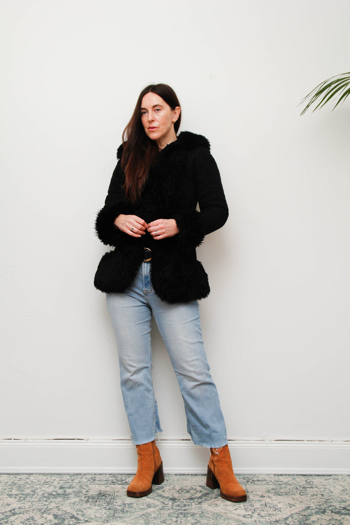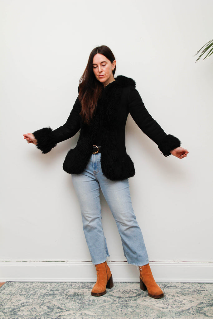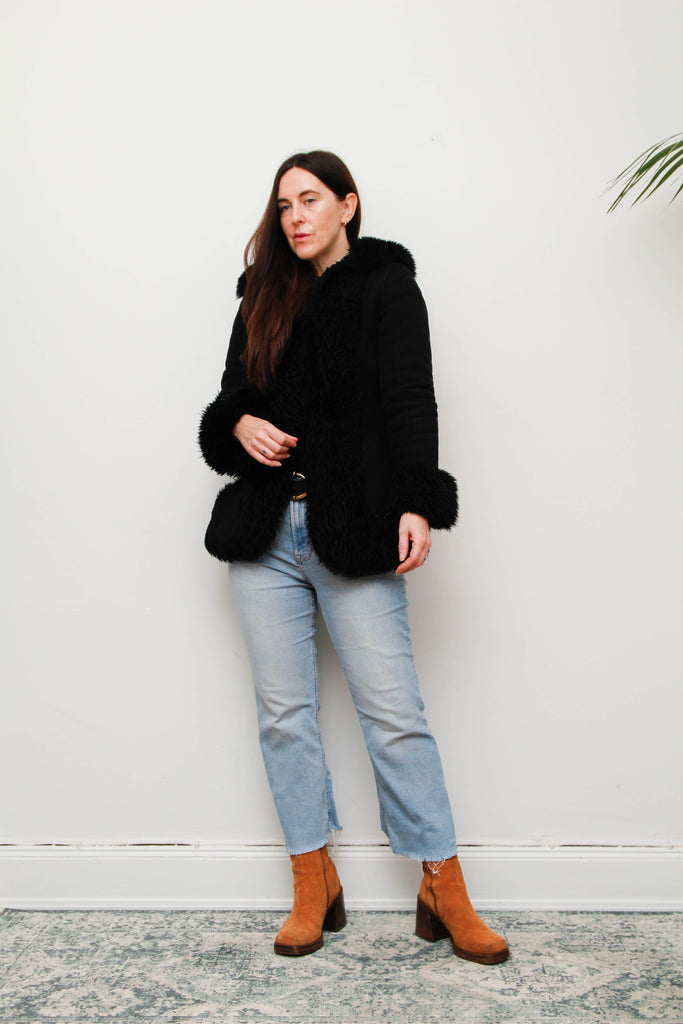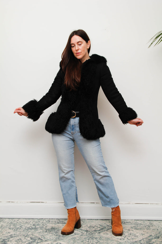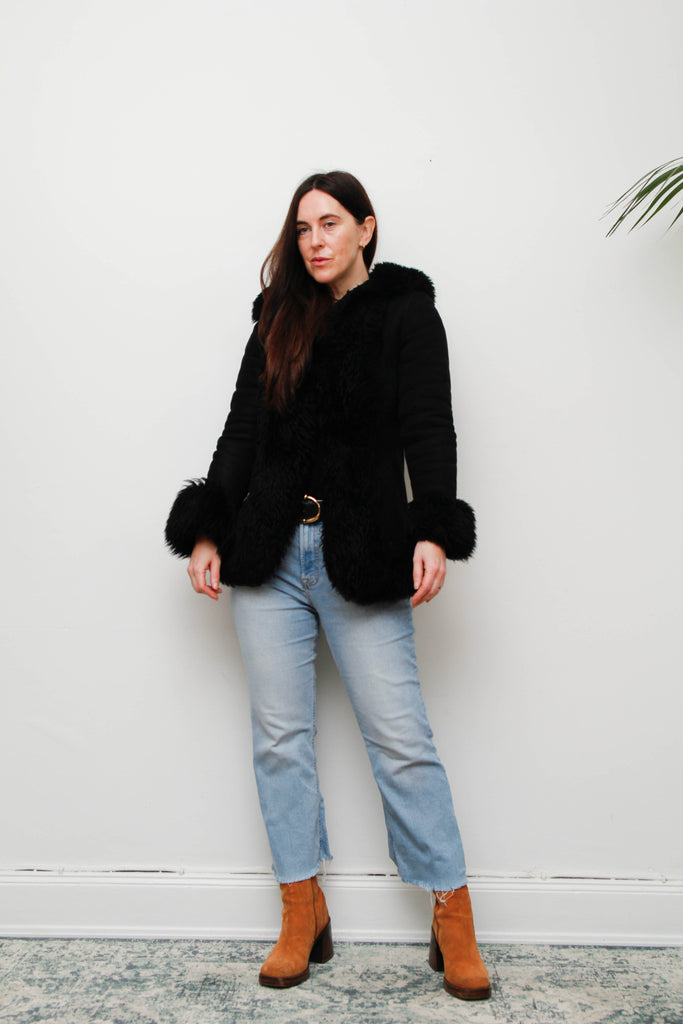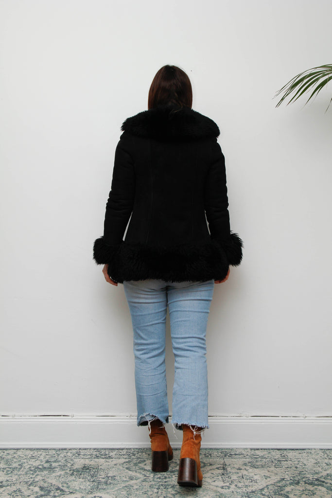 Vintage Black Suede Sheepskin Coat – Gothic Luxury Fur Trim, 100% Suede, Dramatic Statement Outerwear