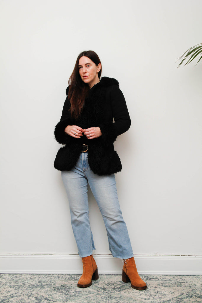 An exquisite and rare vintage black suede coat, trimmed with the most luxurious sheepskin fur. Crafted from soft, high-quality suede, this striking piece remains in exceptional condition, a testament to its careful preservation. The plush black fur cascades around the collar and down the sweep of the coat, creating a dramatic, opulent silhouette. Fully lined with warm cosy fur for warmth and comfort, this coat exudes gothic elegance and timeless sophistication — a true statement piece for collectors and lovers of luxurious vintage outerwear.