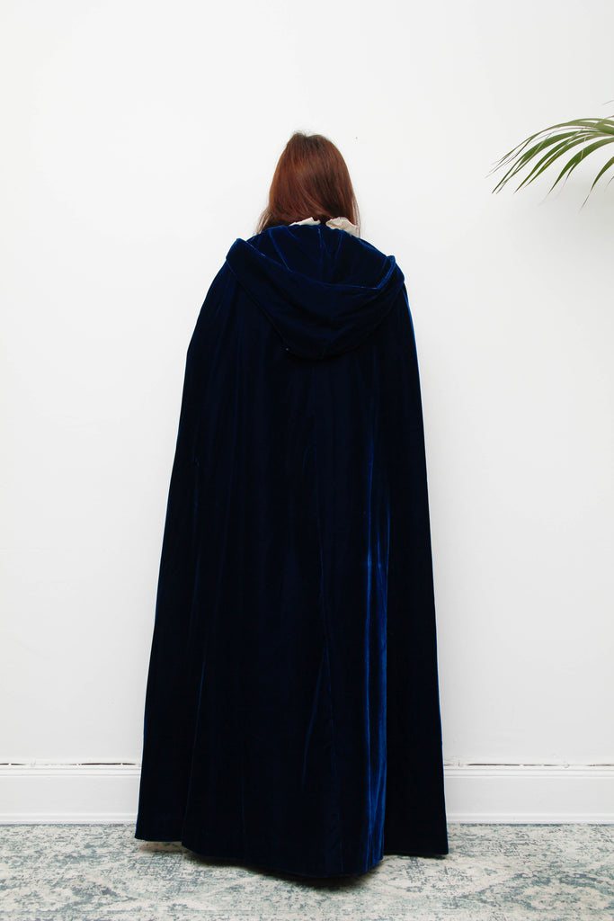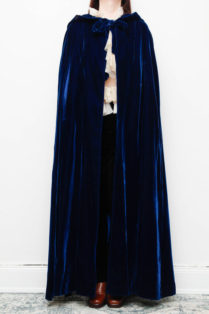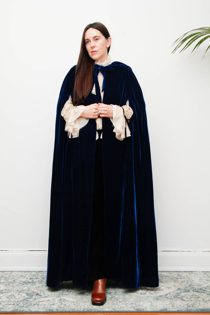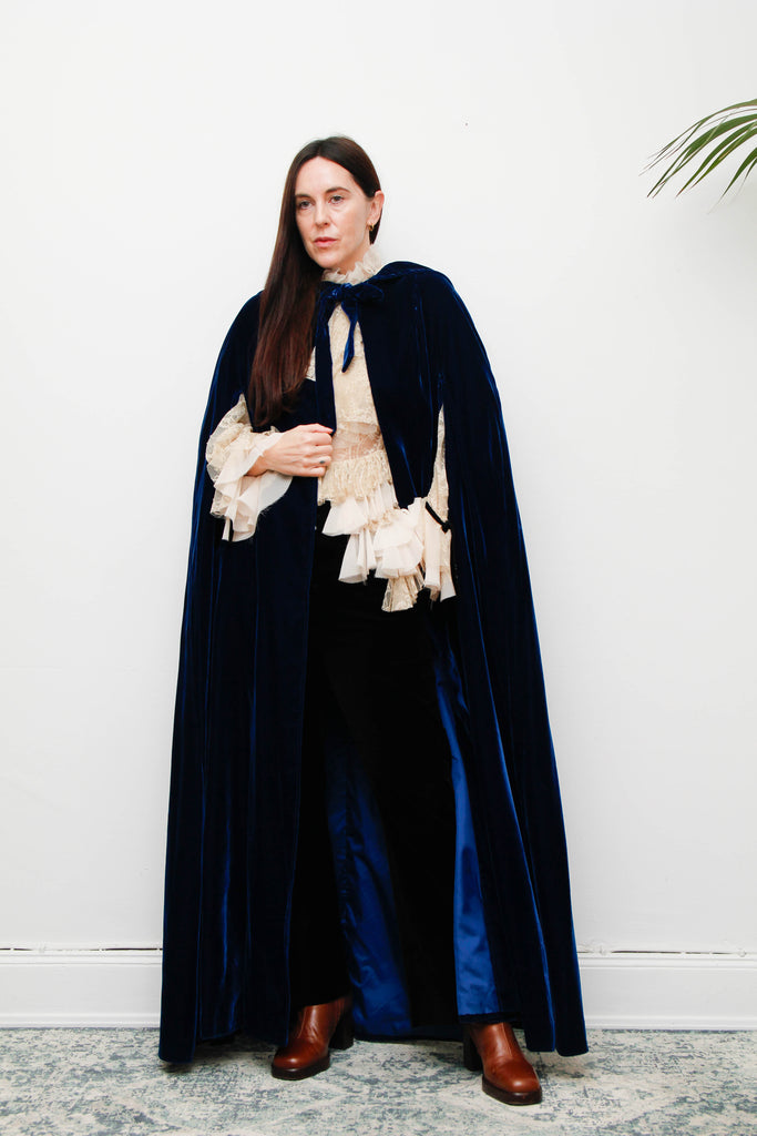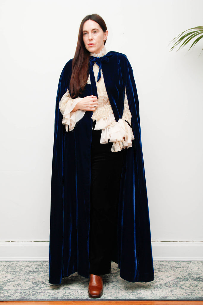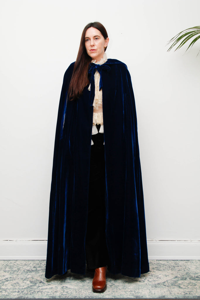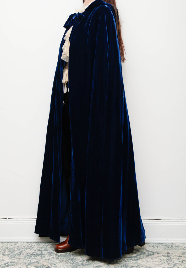 A rare vintage gothic opera cape in luxurious sapphire blue cotton velvet, exuding ethereal elegance. The long, flowing silhouette falls dramatically, enhanced by a neck tie collar and a sheepskin-trimmed collar for added warmth and sophistication.