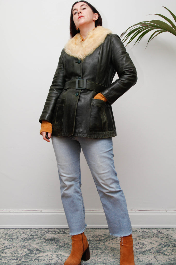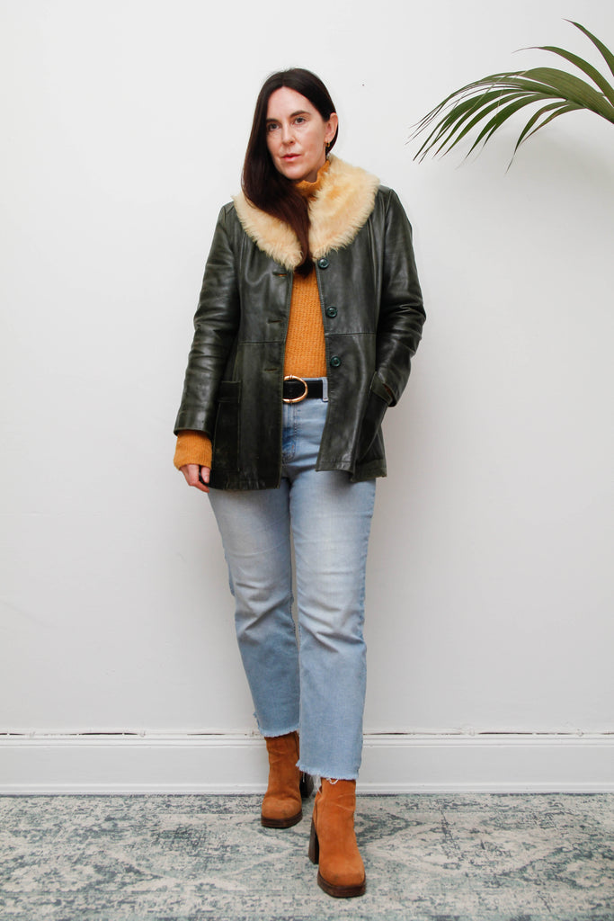 1970s Penny Lane Dark Green Leather Jacket with Sheepskin Collar