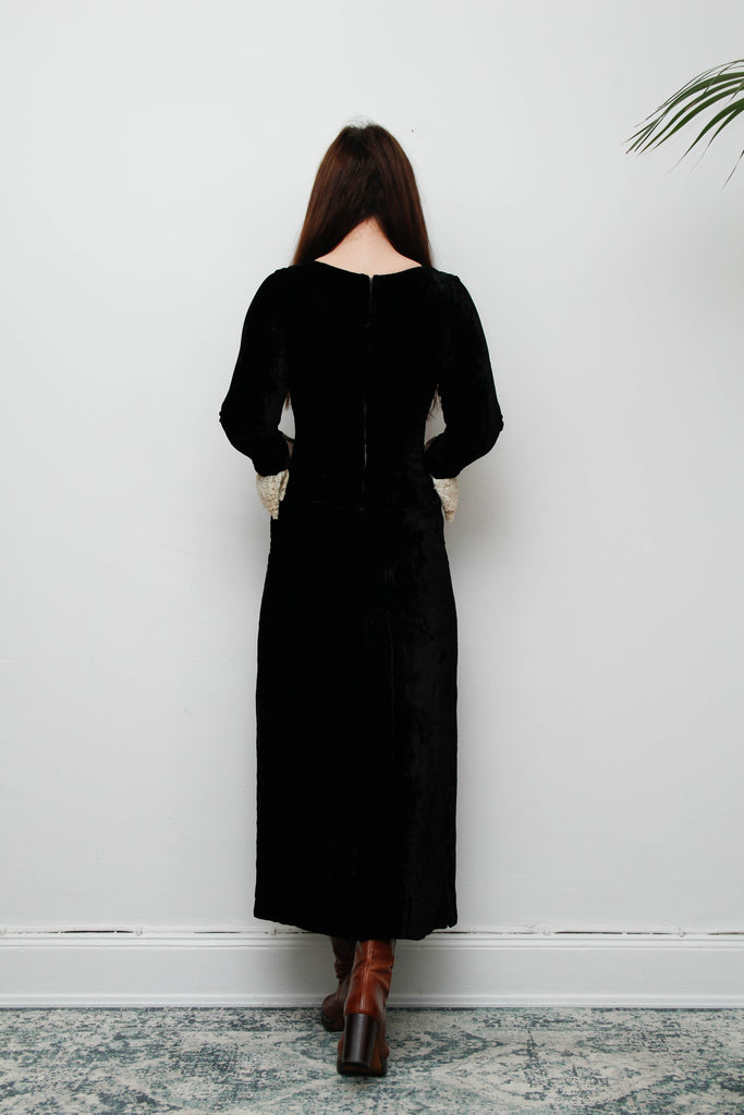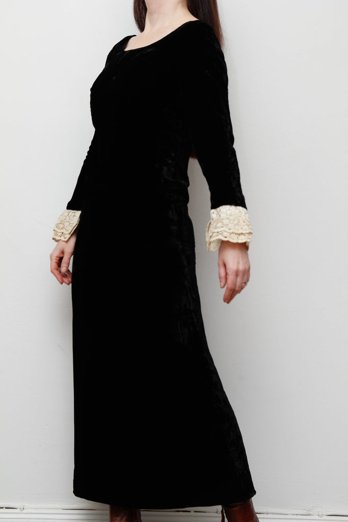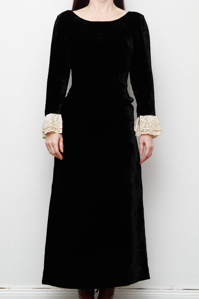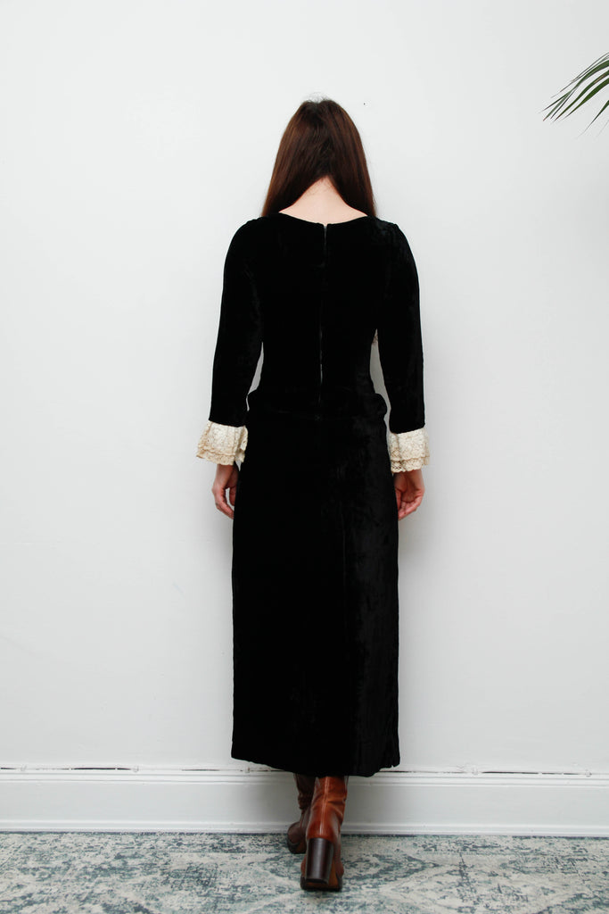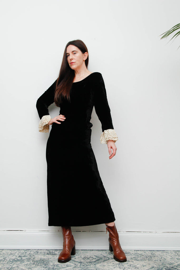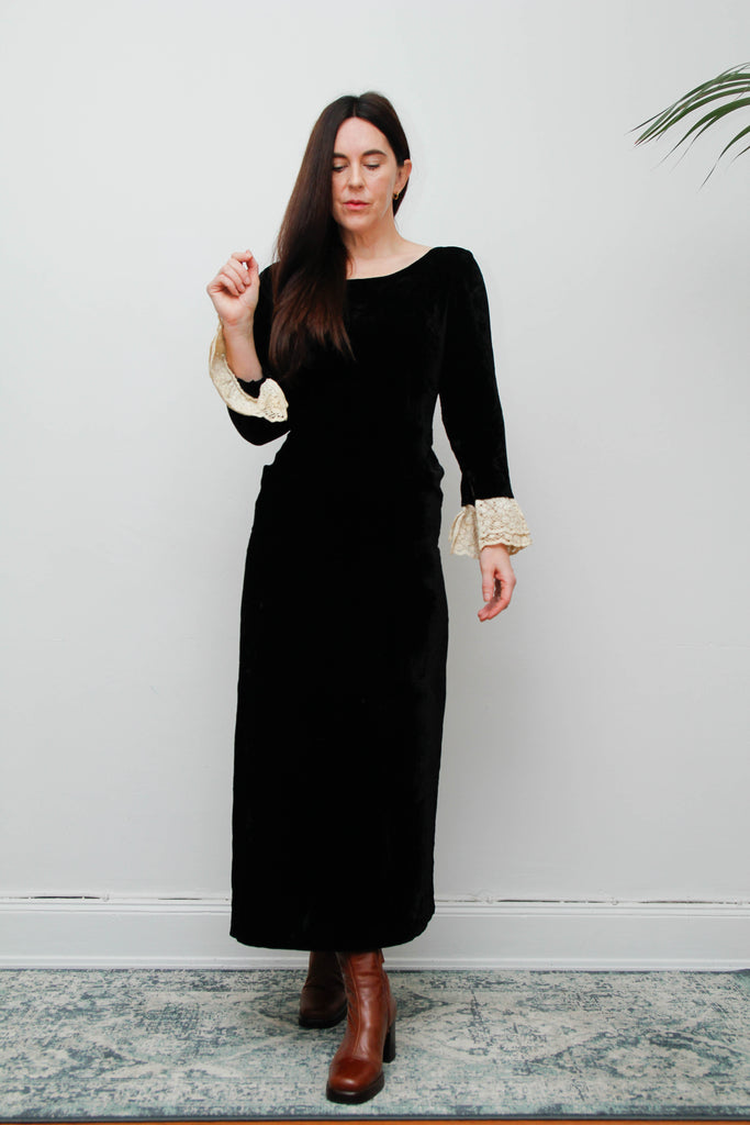 Vintage 1970s Jean Allen Black Velvet Dress – Cream Lace Cuffs, Gothic Elegance, Fully Lined, Zip Back