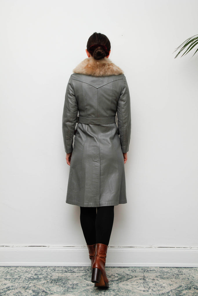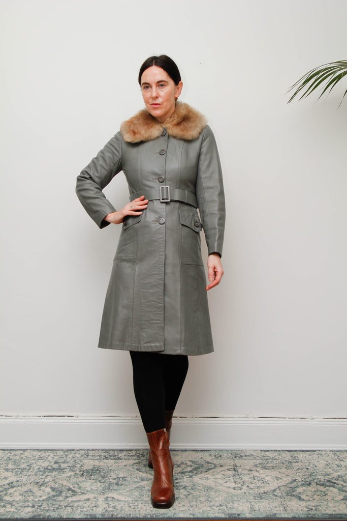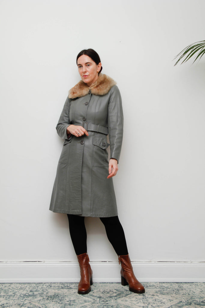A beautiful original 1970s Afghan sheepskin coat, a true Penny Lane–inspired vintage treasure. Crafted from light grey real leather, it features a thick, luxurious sheepskin collar cascading around the neckline for dramatic effect.