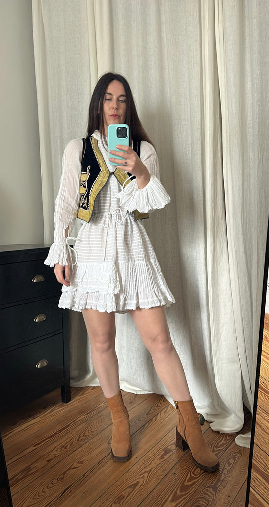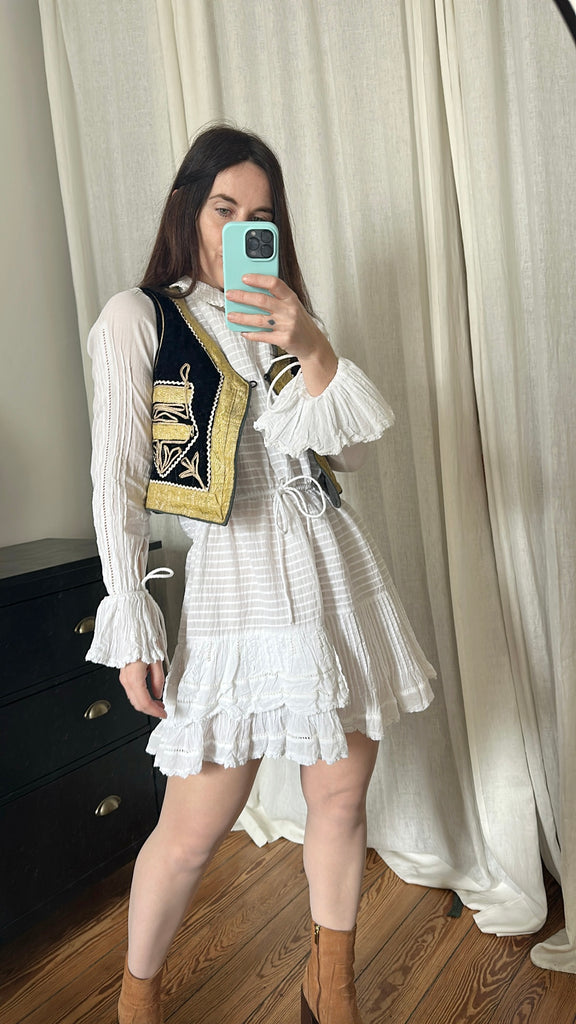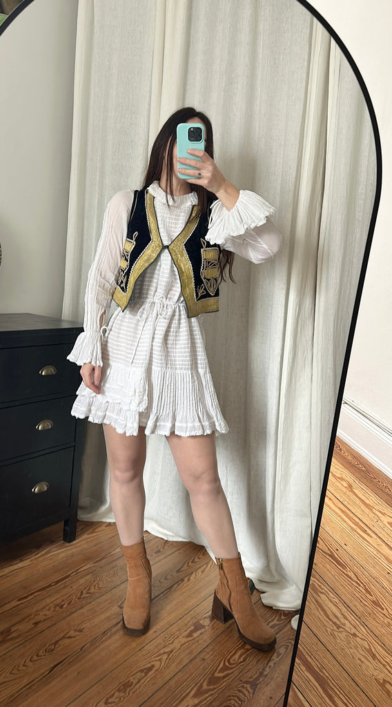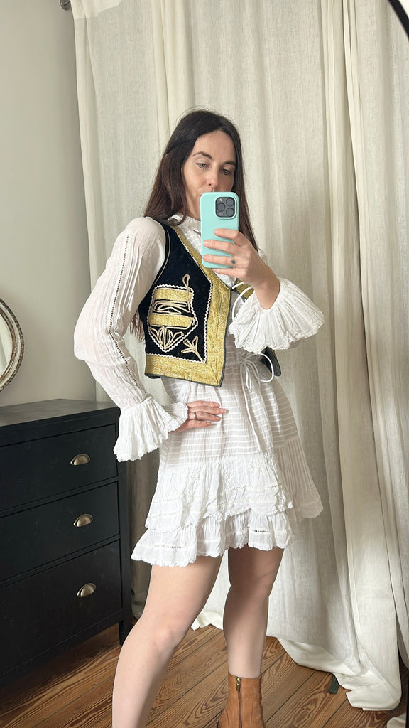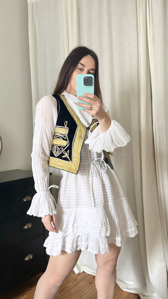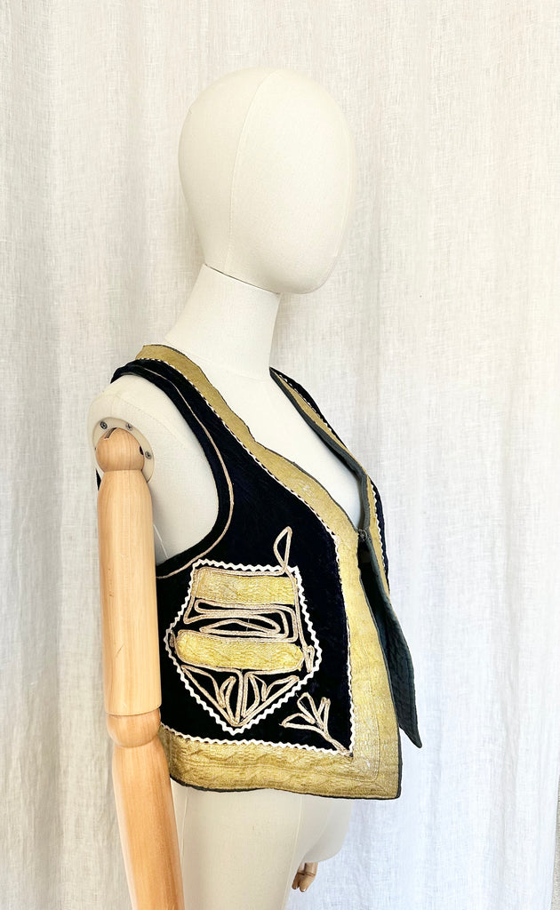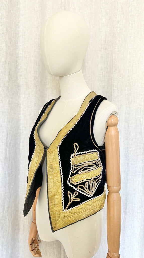An antique-inspired vintage velvet waistcoat, an incredibly rare piece that is seldom found. Crafted from deep navy blue velvet, it features stunning hand-embroidered Ottoman-style detailing with intricate gold threadwork, creating a rich and opulent finish.
