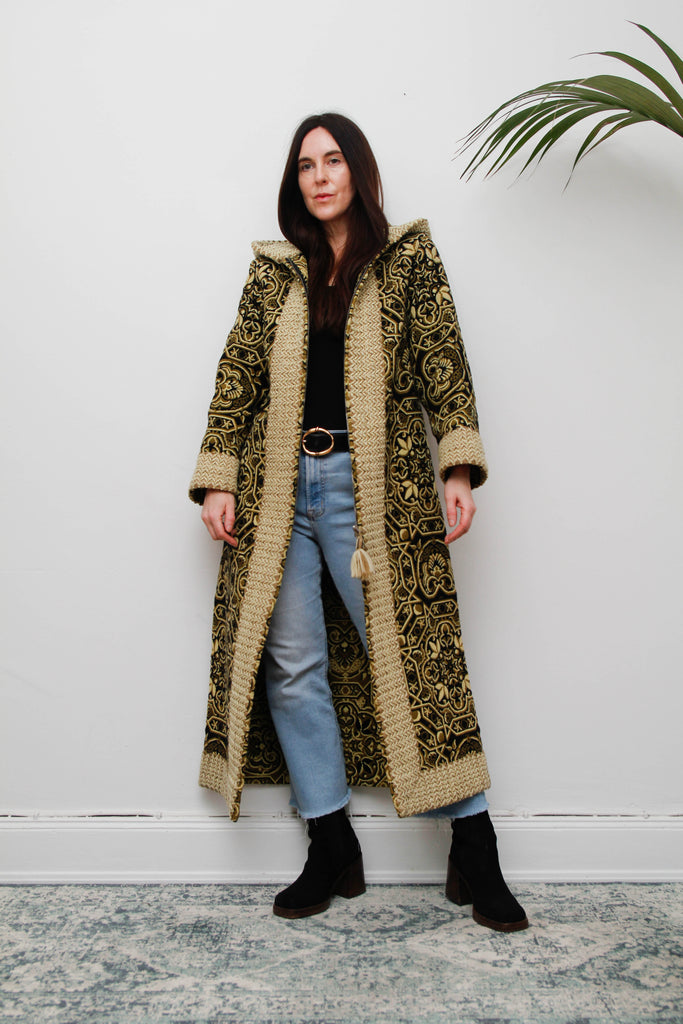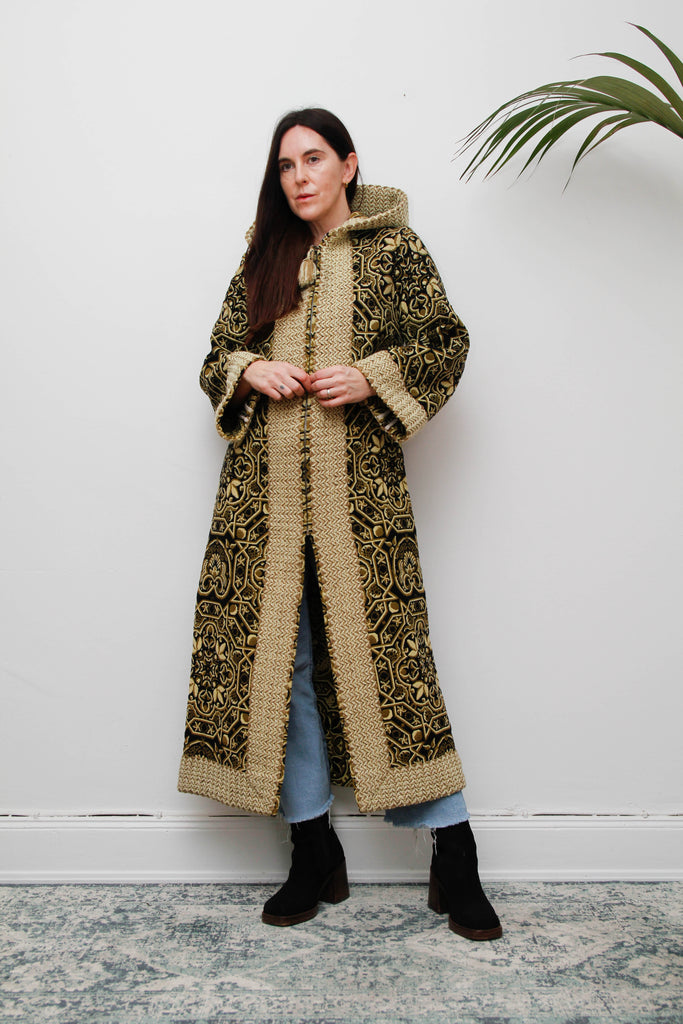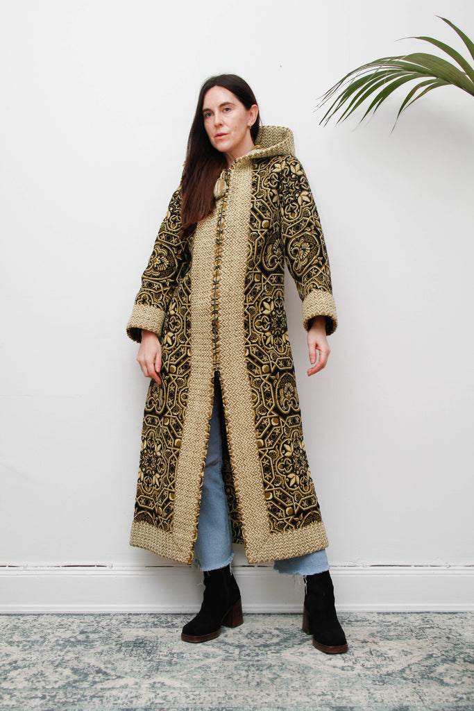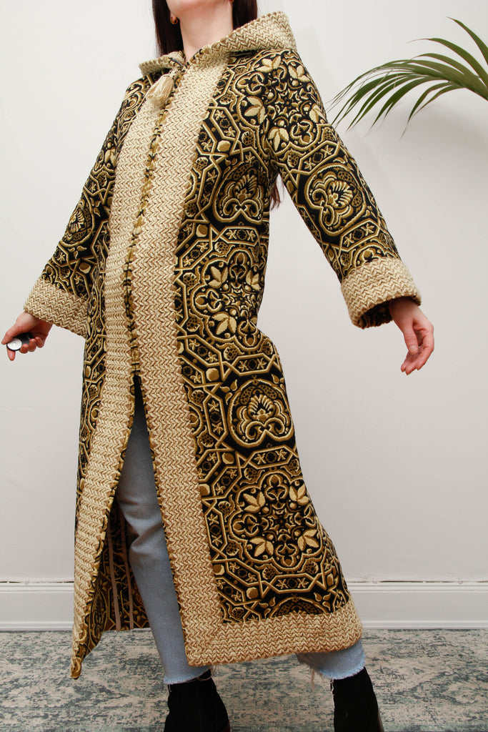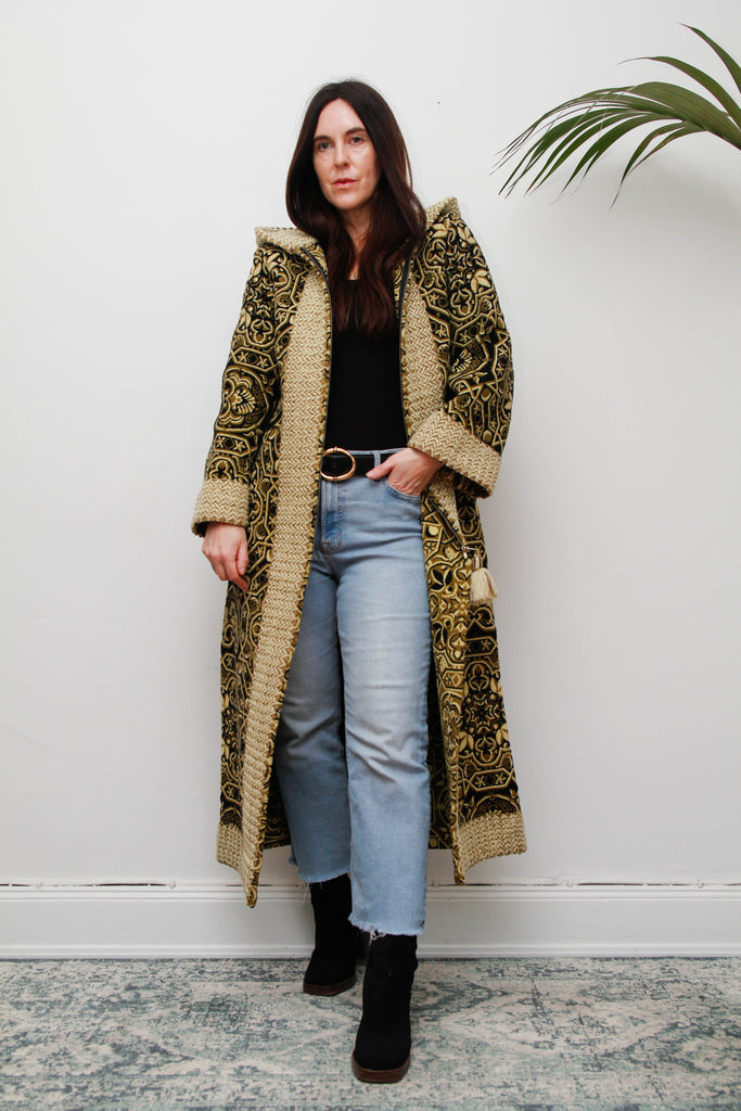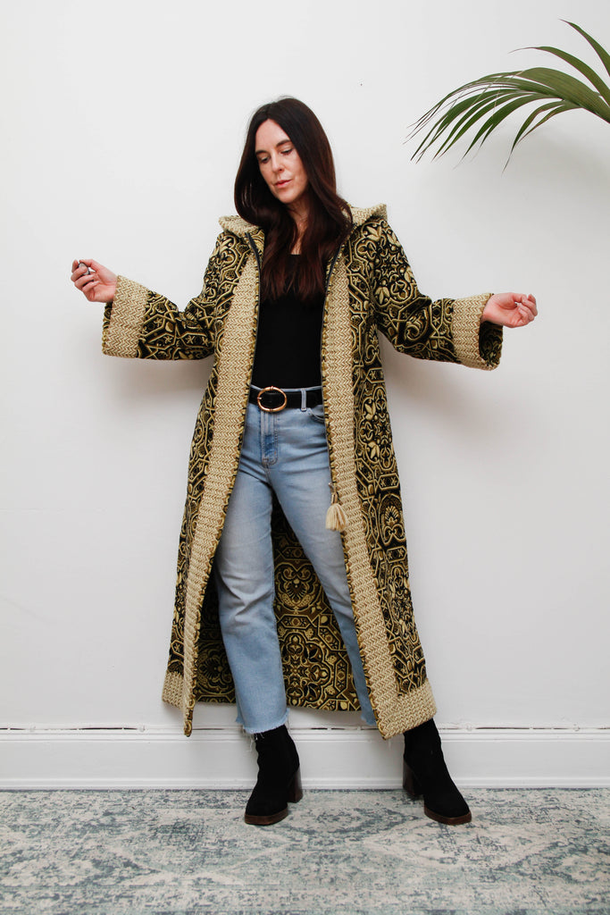A stunning vintage Kashmiri cotton tapestry coat from the 1960s–1970s, a true bohemian showstopper. Crafted from heavy, unlined cotton, it features intricate woven patterns in bold yellow and black hues, creating a striking statement piece.