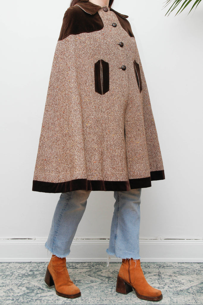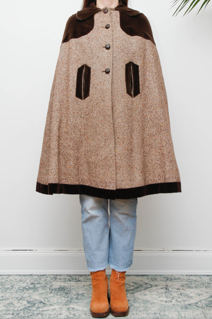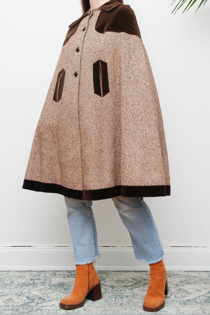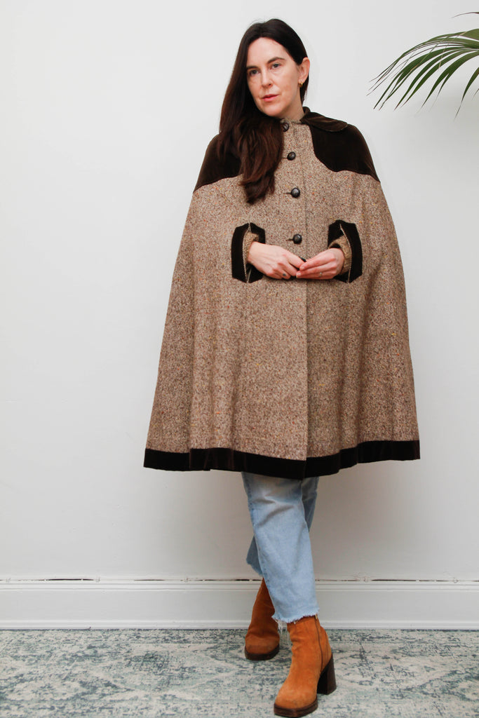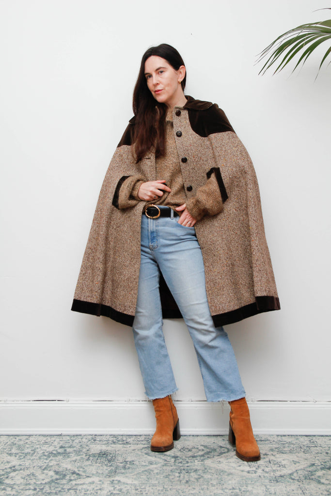 1970s Tweed Wool Cape with Chocolate Velvet Trim - Classic Country Style