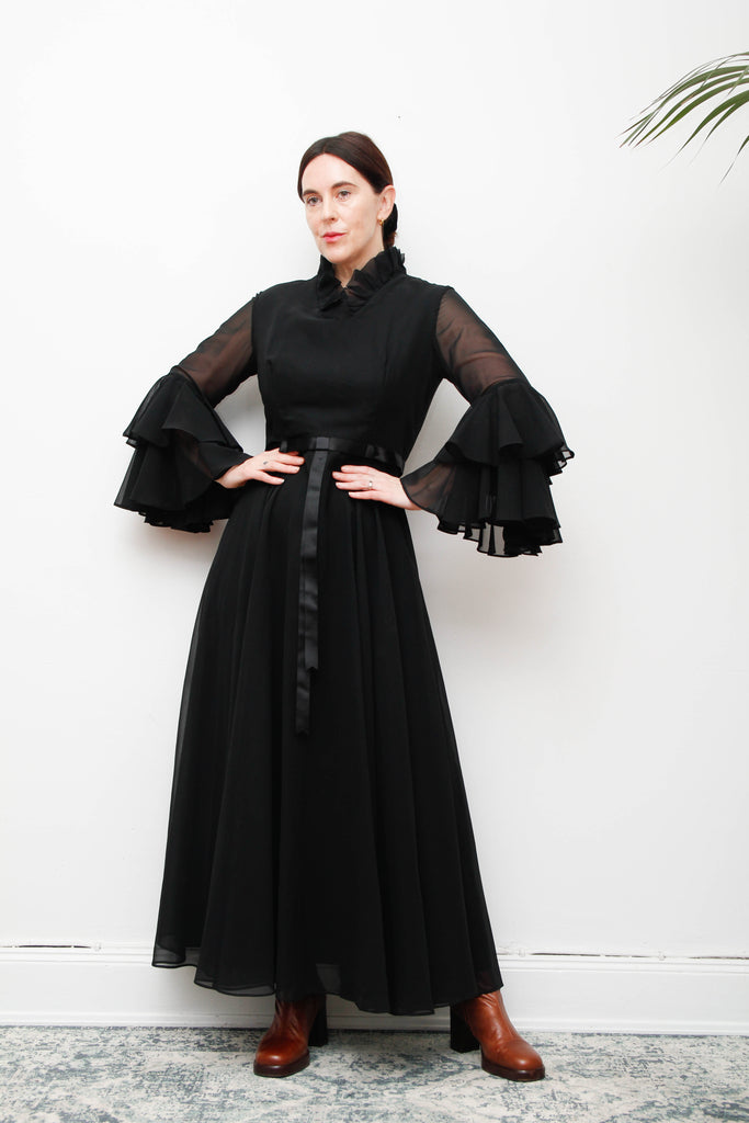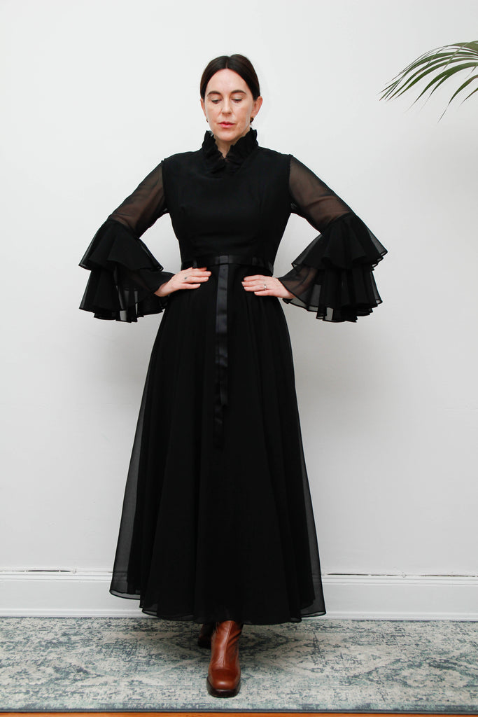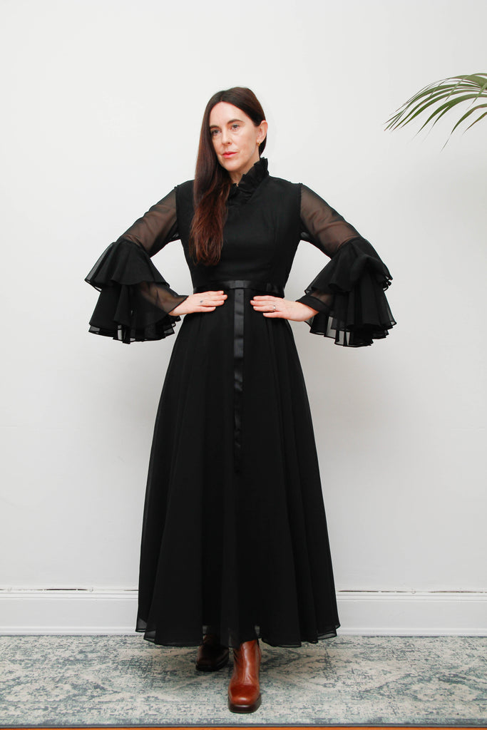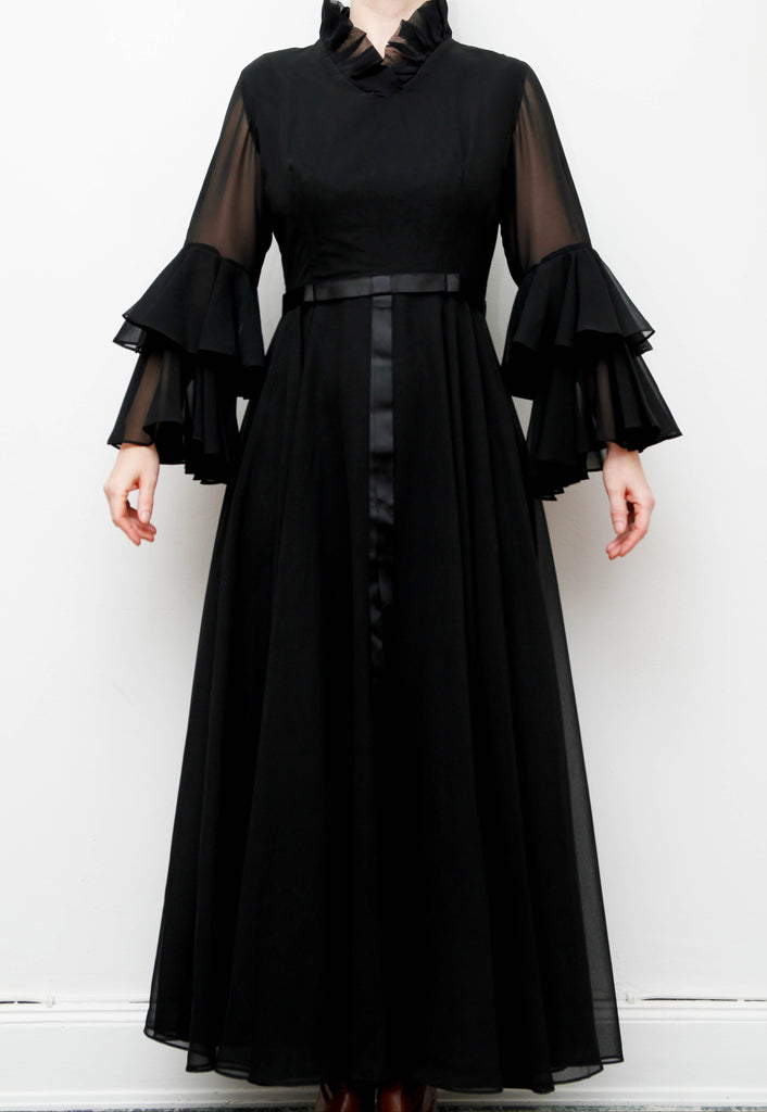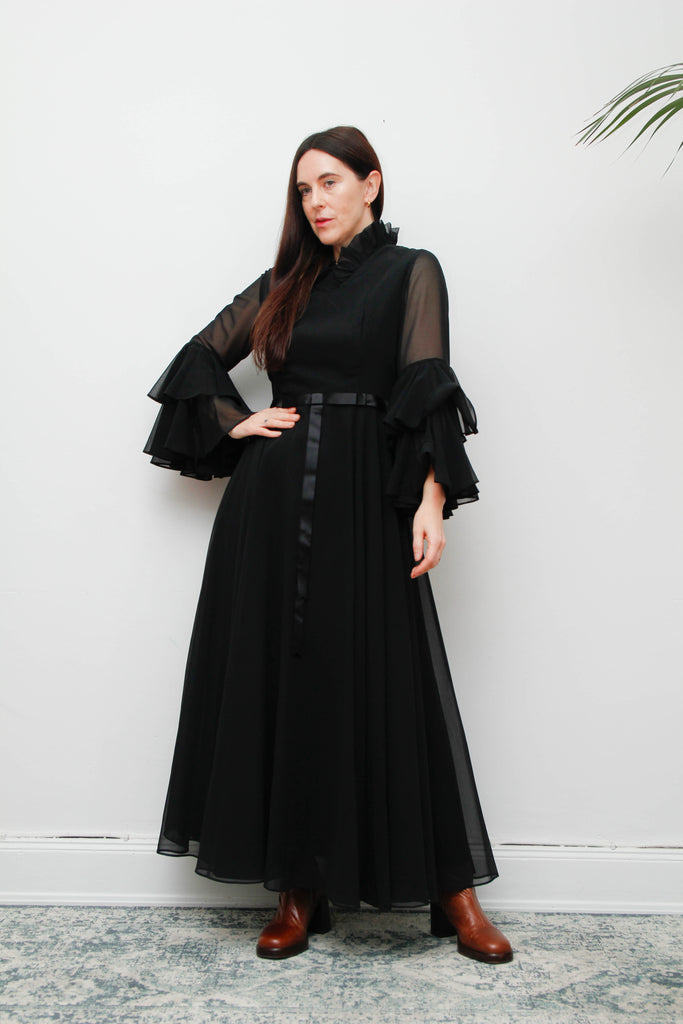An extraordinary vintage black gothic dress — utterly bewitching and ethereal. Featuring a high Victorian collar and layered flitted sleeves in flowing black chiffon, this dramatic piece is both romantic and darkly elegant. Wide, wafting sleeves create captivating movement, while a black satin ribbon defines the bodice and skirt. Fitted at the waist with a back zip, it balances structure and flowing elegance. A rare vintage treasure for gothic, romantic, or statement wardrobes.