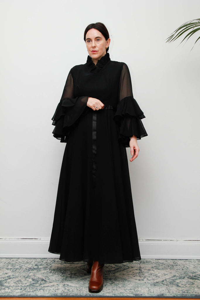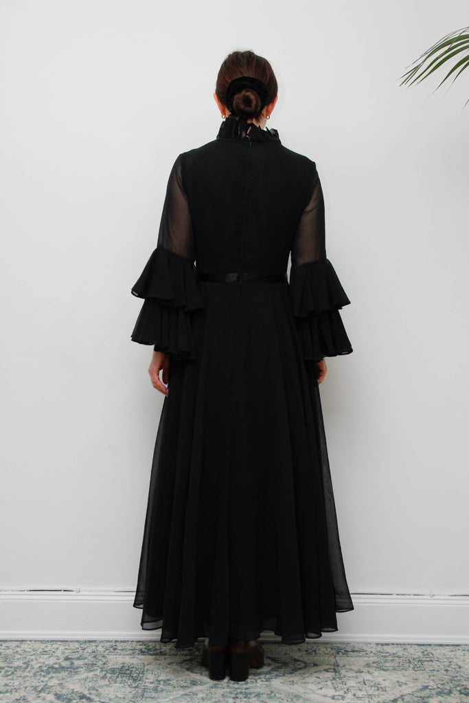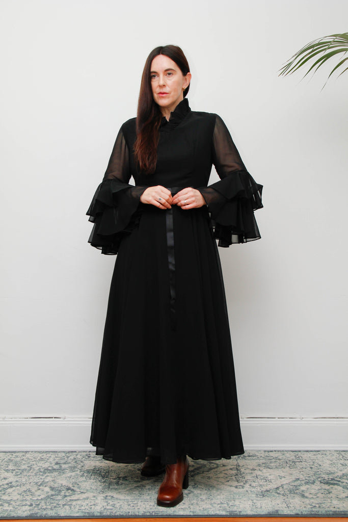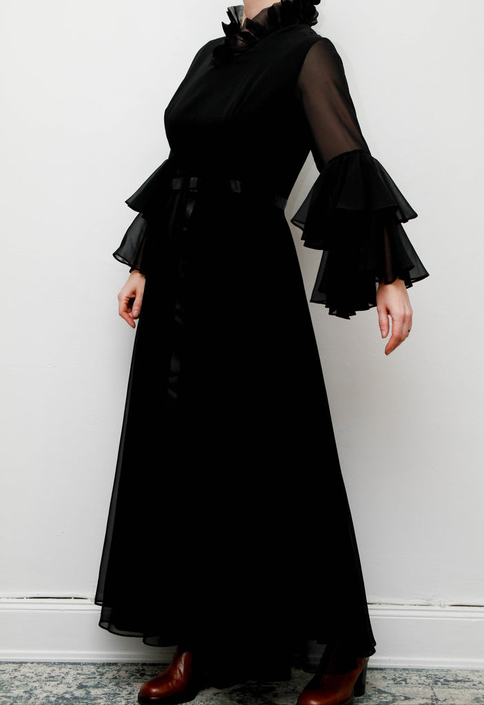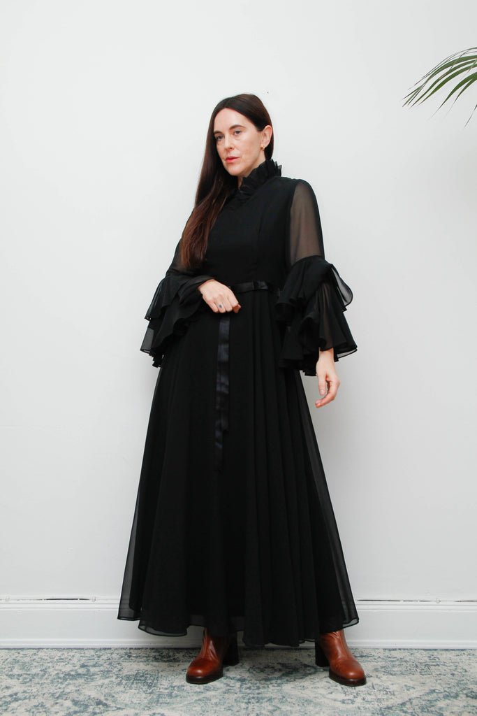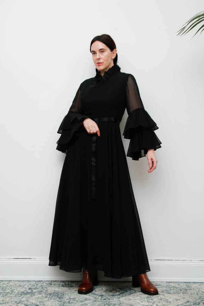 An extraordinary vintage black gothic dress — utterly bewitching and ethereal. Featuring a high Victorian collar and layered flitted sleeves in flowing black chiffon, this dramatic piece is both romantic and darkly elegant. Wide, wafting sleeves create captivating movement, while a black satin ribbon defines the bodice and skirt. Fitted at the waist with a back zip, it balances structure and flowing elegance. A rare vintage treasure for gothic, romantic, or statement wardrobes.