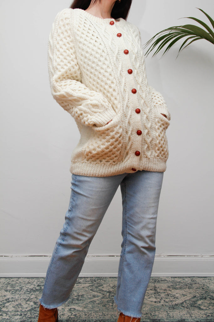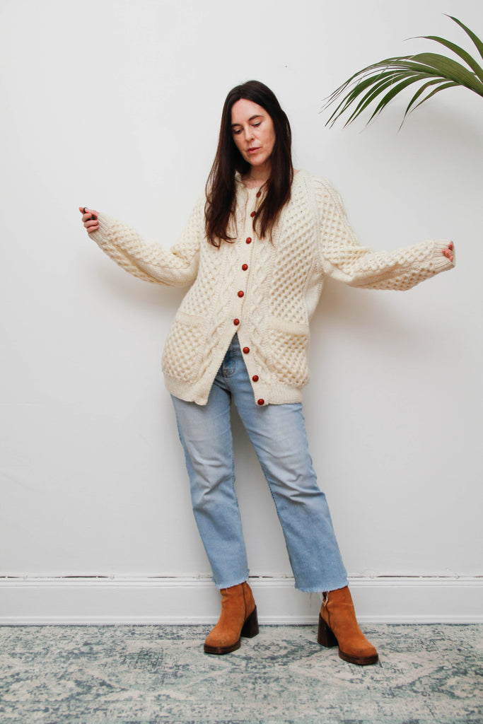 Vintage Cream Aran Wool Cardigan with Leather Shank Buttons