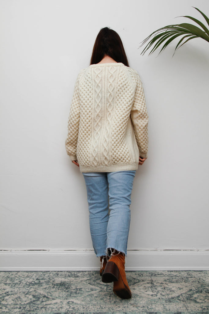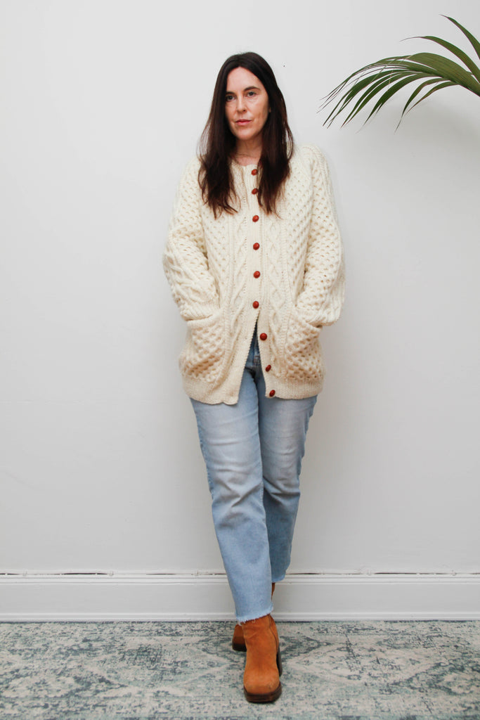 This is an amazing and beautifully crafted cream Aran wool cardigan, made from heavily knitted Irish wool with a wonderfully oversized, relaxed fit. Rich in texture and warmth, it has a satisfyingly heavy, cosy feel, perfect for everyday wear.