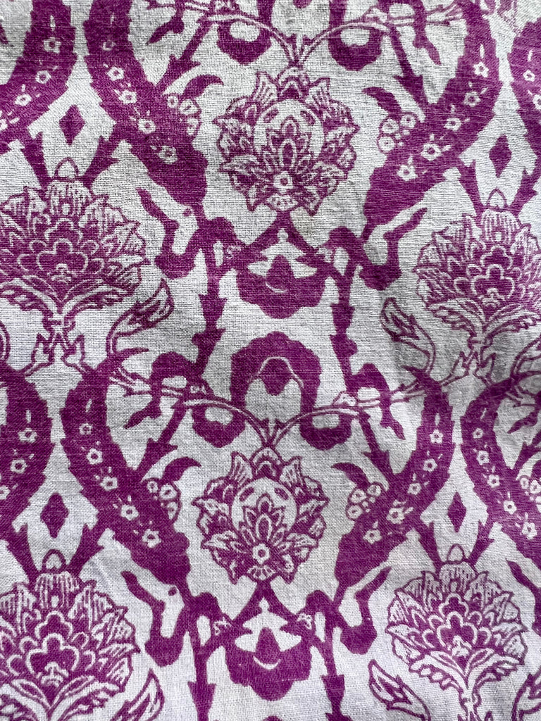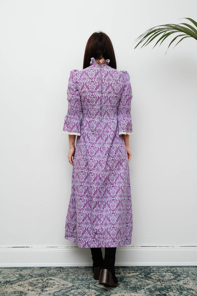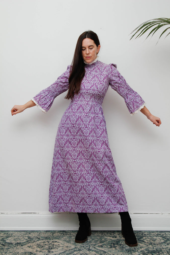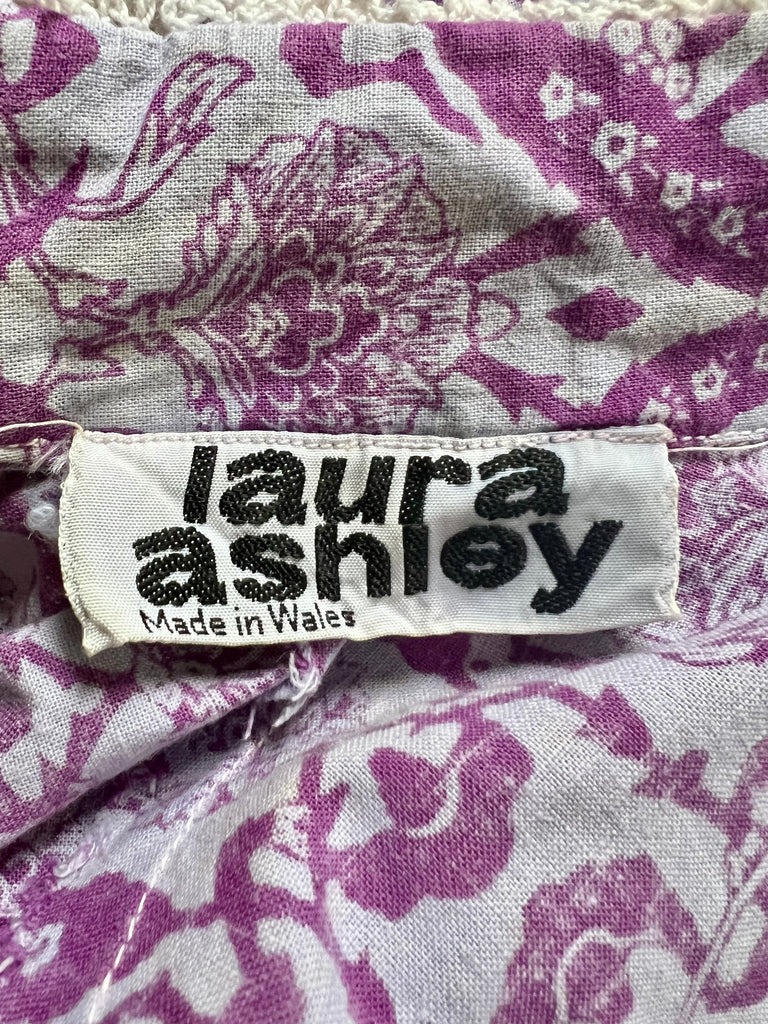 A very rare 1960s Laura Ashley cotton maxi dress, from the iconic “Laura Ashley. Made in Wales” era. Crafted from 100% purple cotton, this dress features a Victorian-style floral and vine print with the signature artisan quality of 1960s flatbed printing. Designed with a flattering Empire-line fit, it has elasticated shirred midriff stunning fluted sleeves with smocking, a high collar, and a long straight skirt. The collar and sleeves are delicately trimmed with white cotton crocheted lace, and a long metal zipper at the back confirms its late 1960s provenance. Complete with the original long white label, this dress is a true collector’s vintage treasure.
