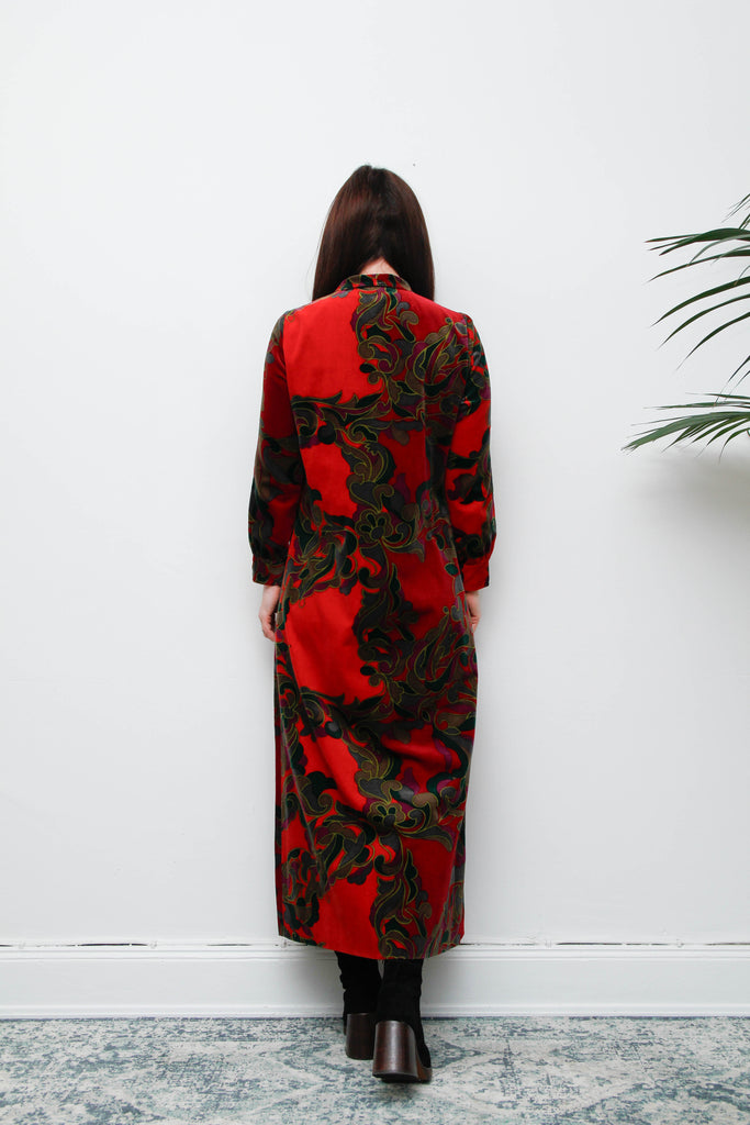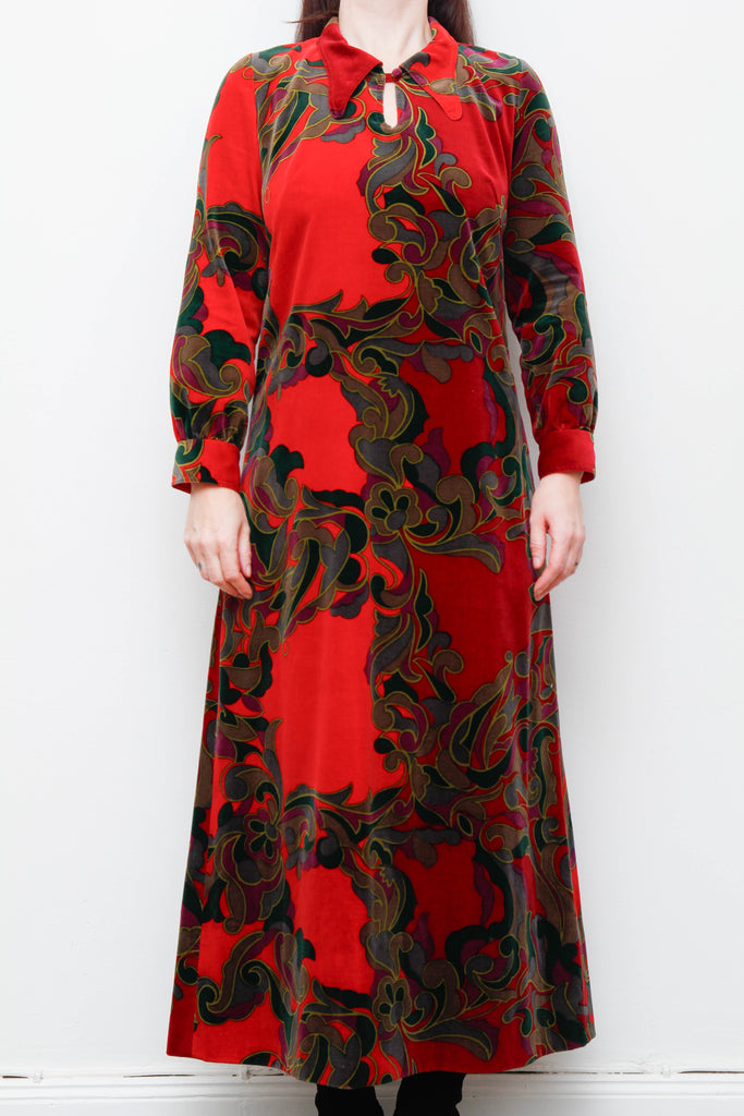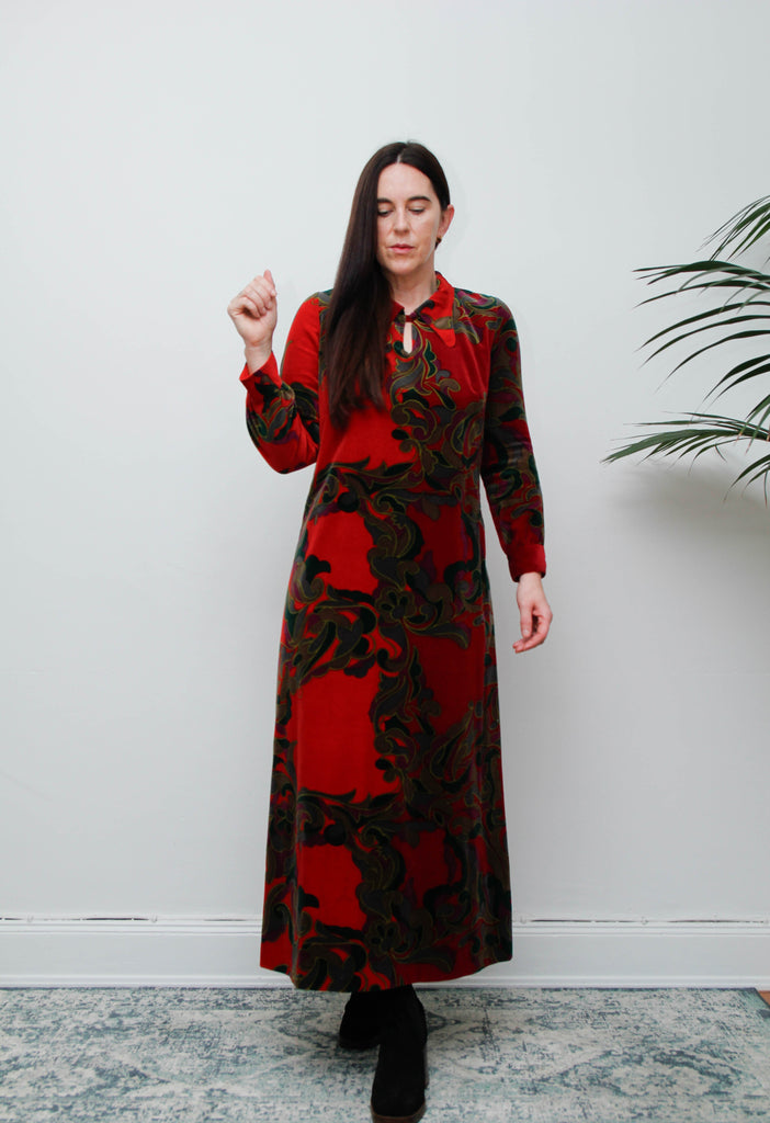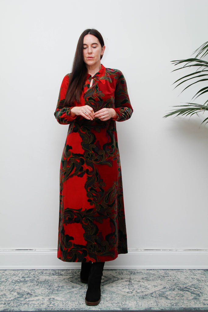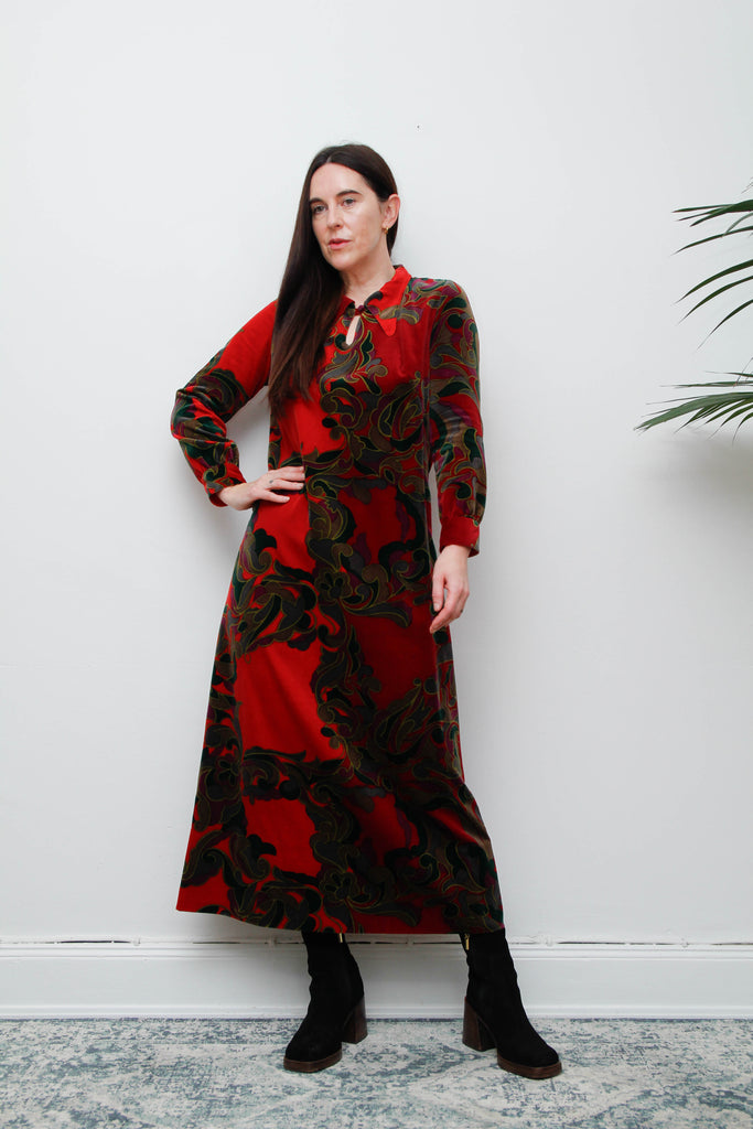 Crafted from luxurious cotton velvet, this striking maxi-length dress features a dagger-style collar with button-up detail and swirling Art Nouveau floral patterns in rich greens and reds. Fitted through the waist and fully lined, it combines dramatic, gothic-inspired elegance with timeless vintage bohemian charm — a rare and unforgettable piece.
